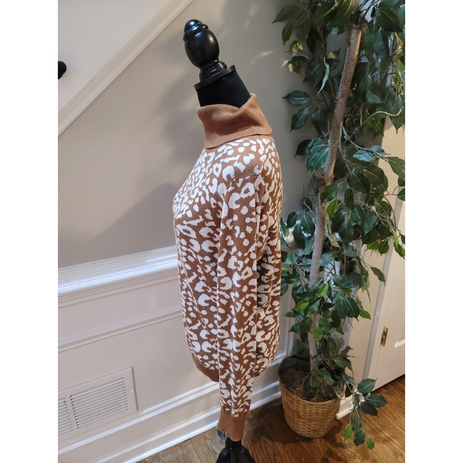 14th and Union women’s turtleneck sweater in size Small. Featuring a bold brown and white leopard print, this soft cotton rayon blend offers both comfort and style. The fitted design with long sleeves makes it perfect for layering or wearing alone, ideal for casual outings, office wear, or a night out.