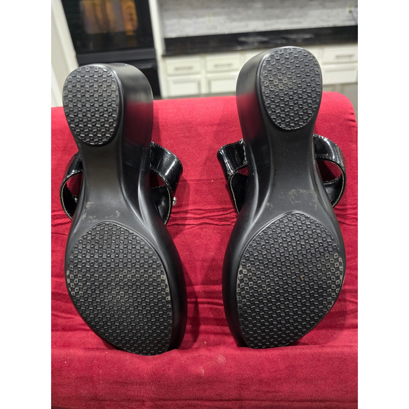 Athena Alexander women’s sandals, featuring a chic black patent finish and sparkling rhinestone embellishments across the straps. Designed in a slip-on style with a comfortable wedge heel, these size 7 sandals combine elegance and comfort, perfect for evening wear, parties, or casual chic outings. Durable rubber soles ensure stability with every step.