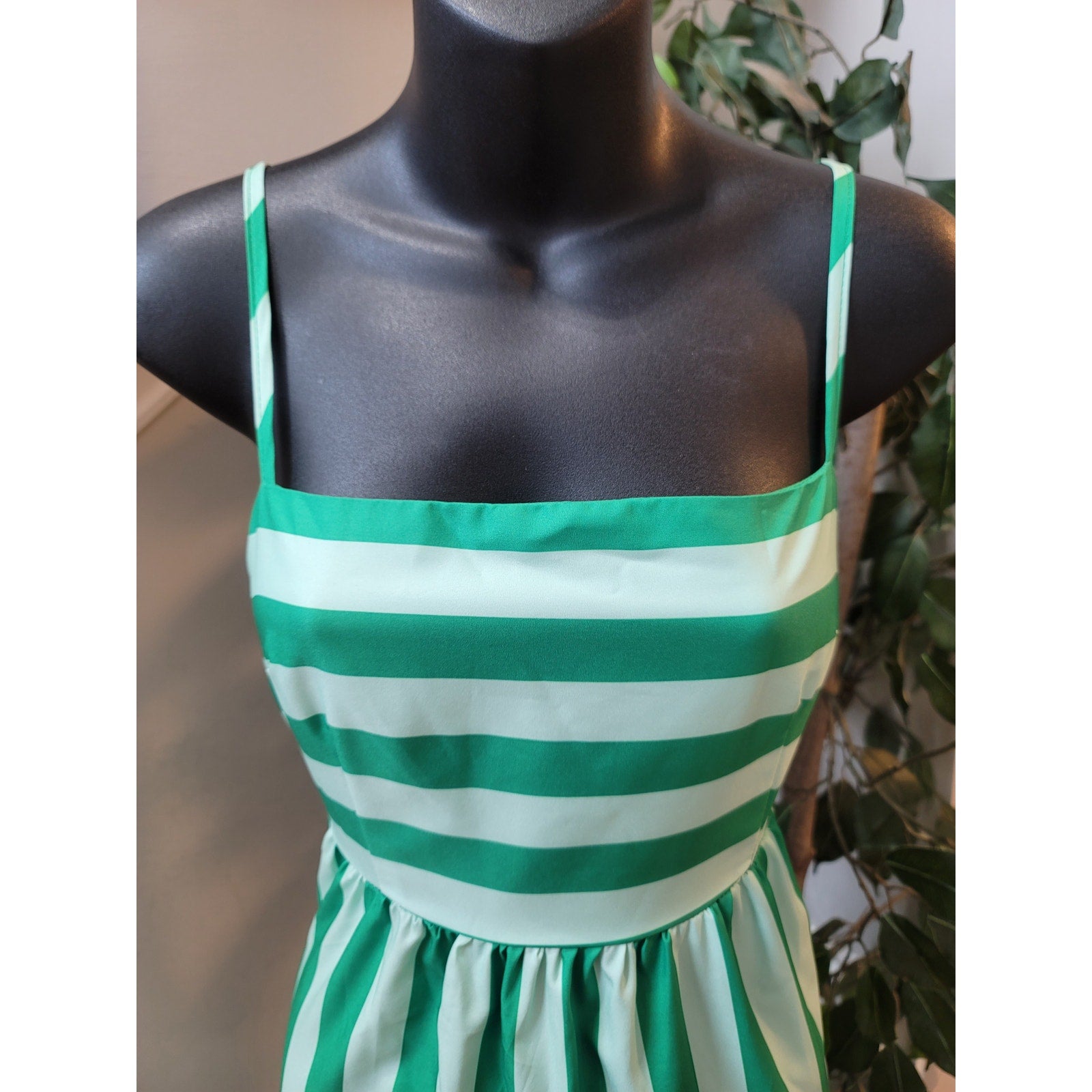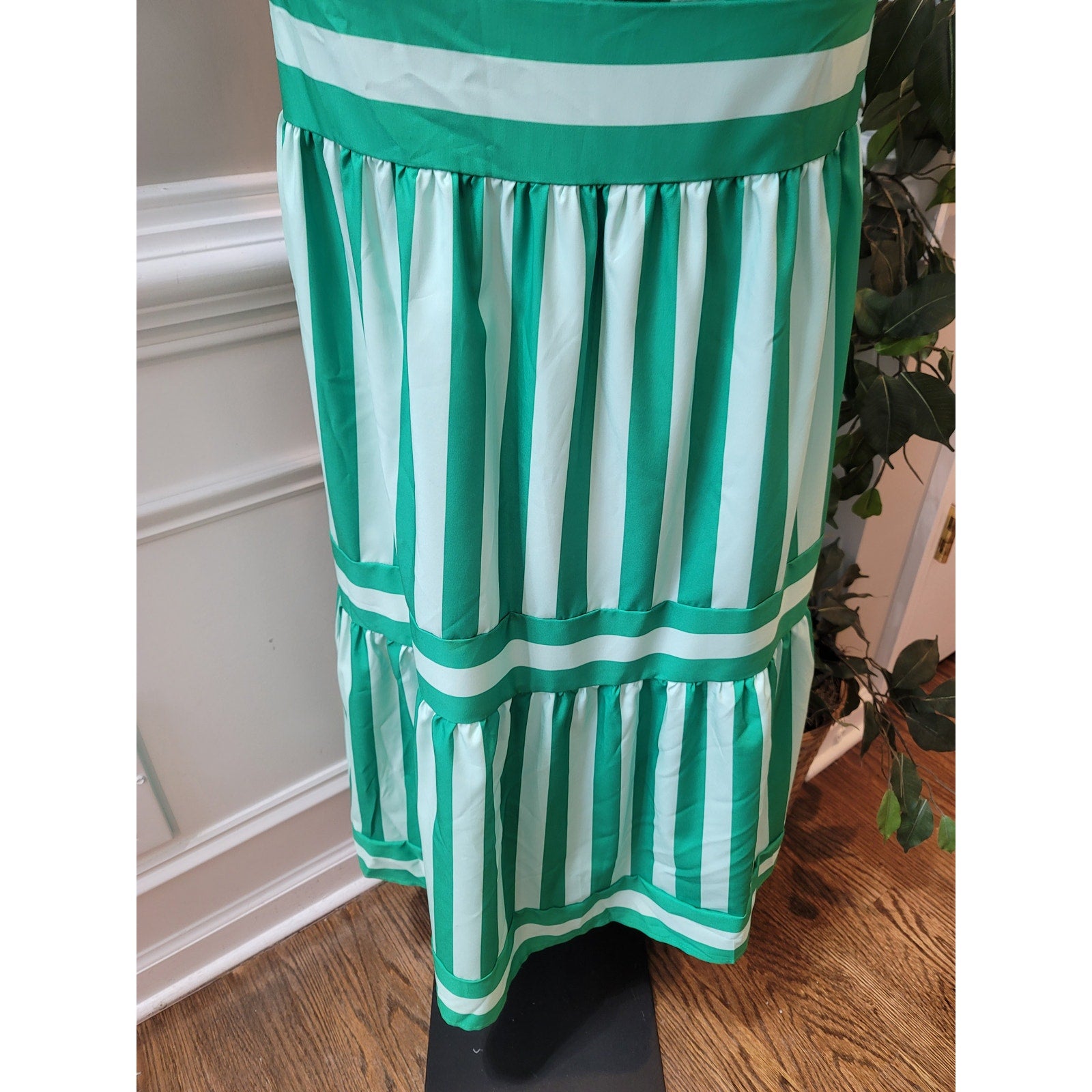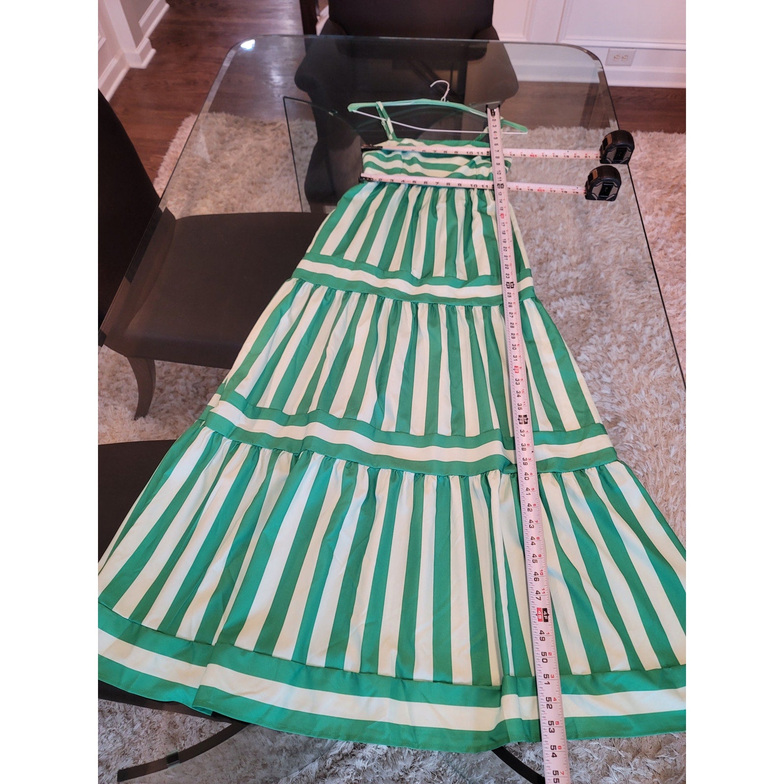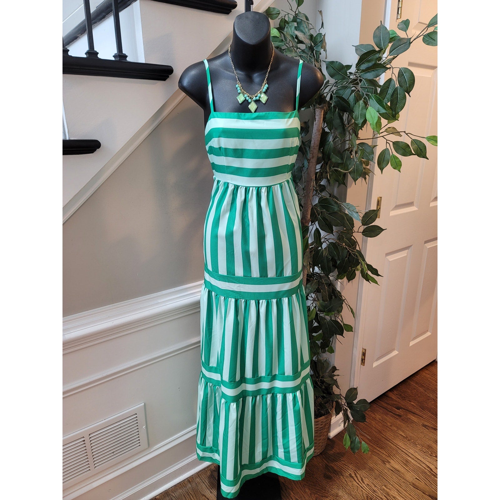 Green and white striped maxi dress in size Small is perfect for warm weather and casual outings. Made from a comfortable polyester and spandex blend, it features a sleeveless design, gathered waist, and tiered skirt for a flattering silhouette. Ideal for summer vacations, garden parties, or weekend getaways.