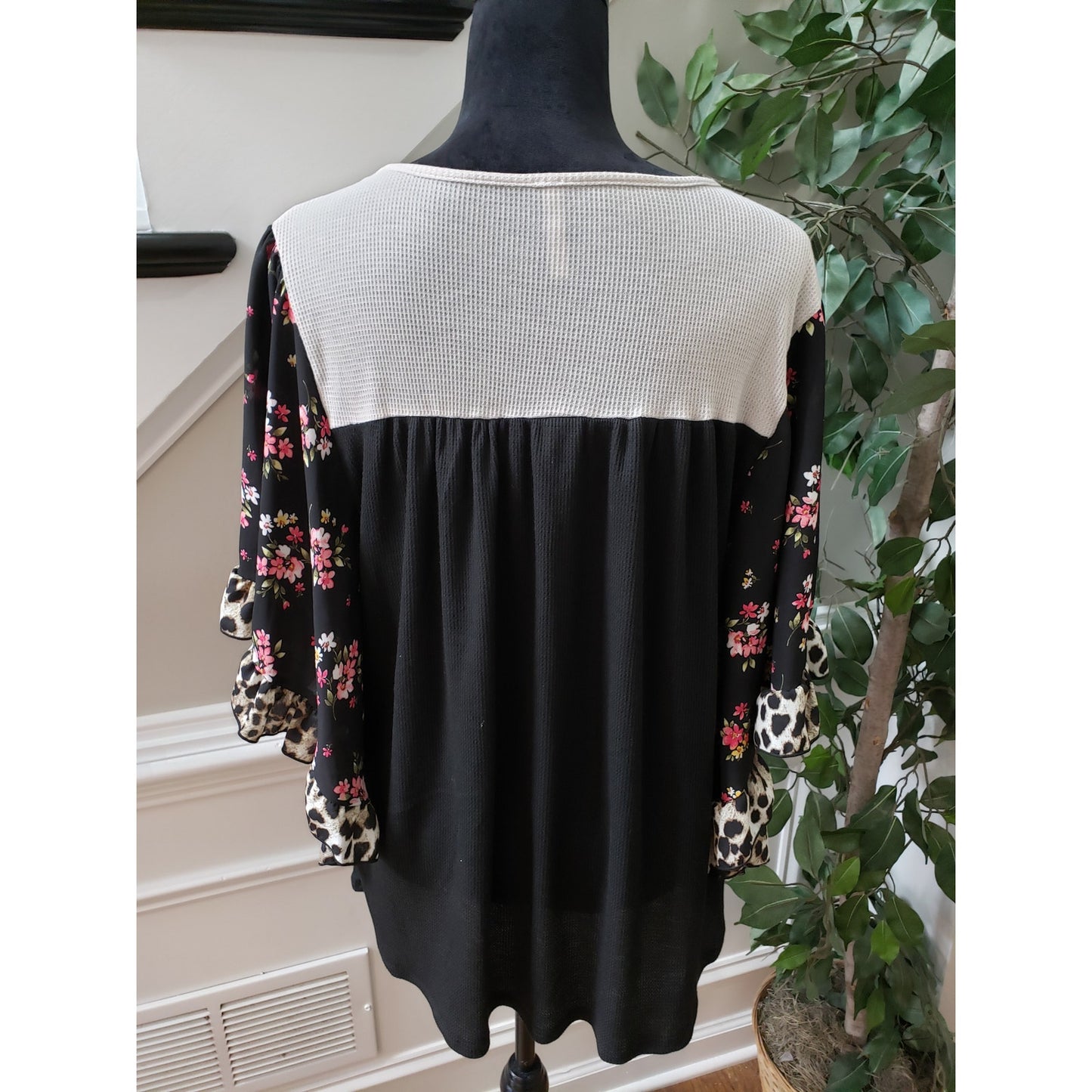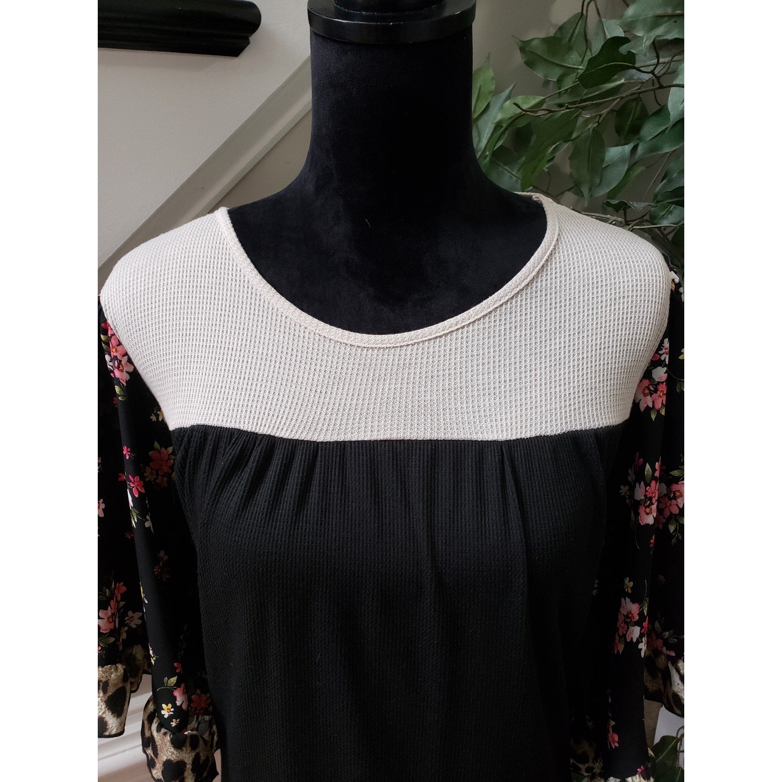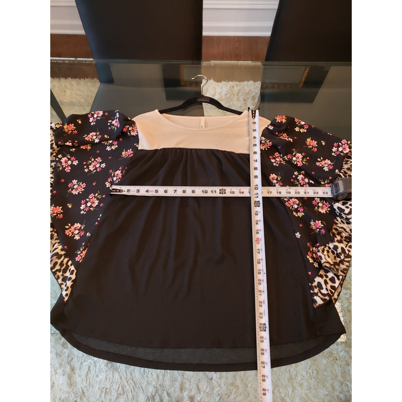 Celeste Top Blouse Women Size Small Black & Beige Floral Short Sleeve Round Neck