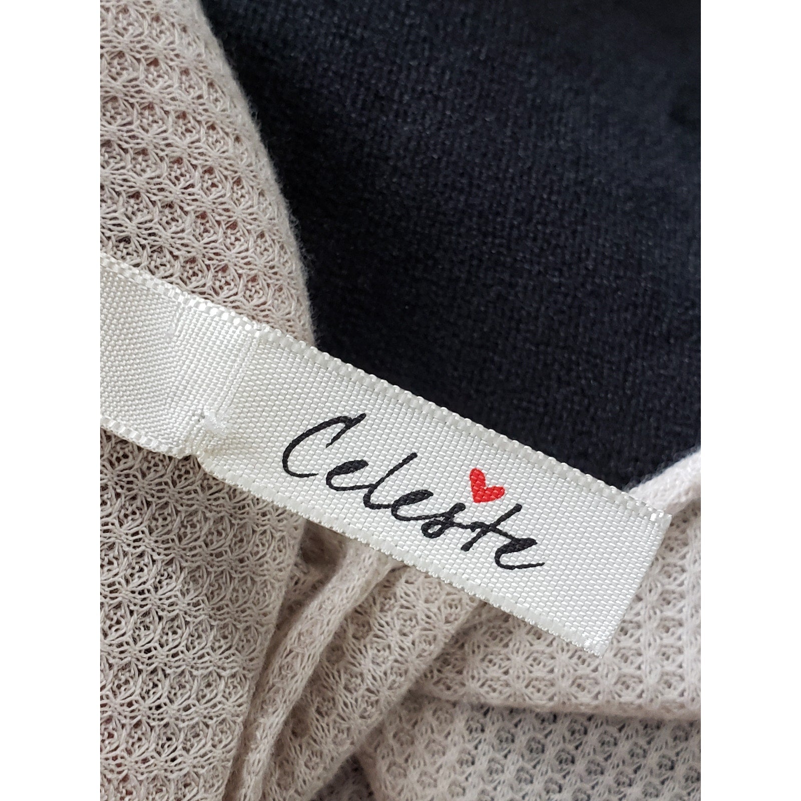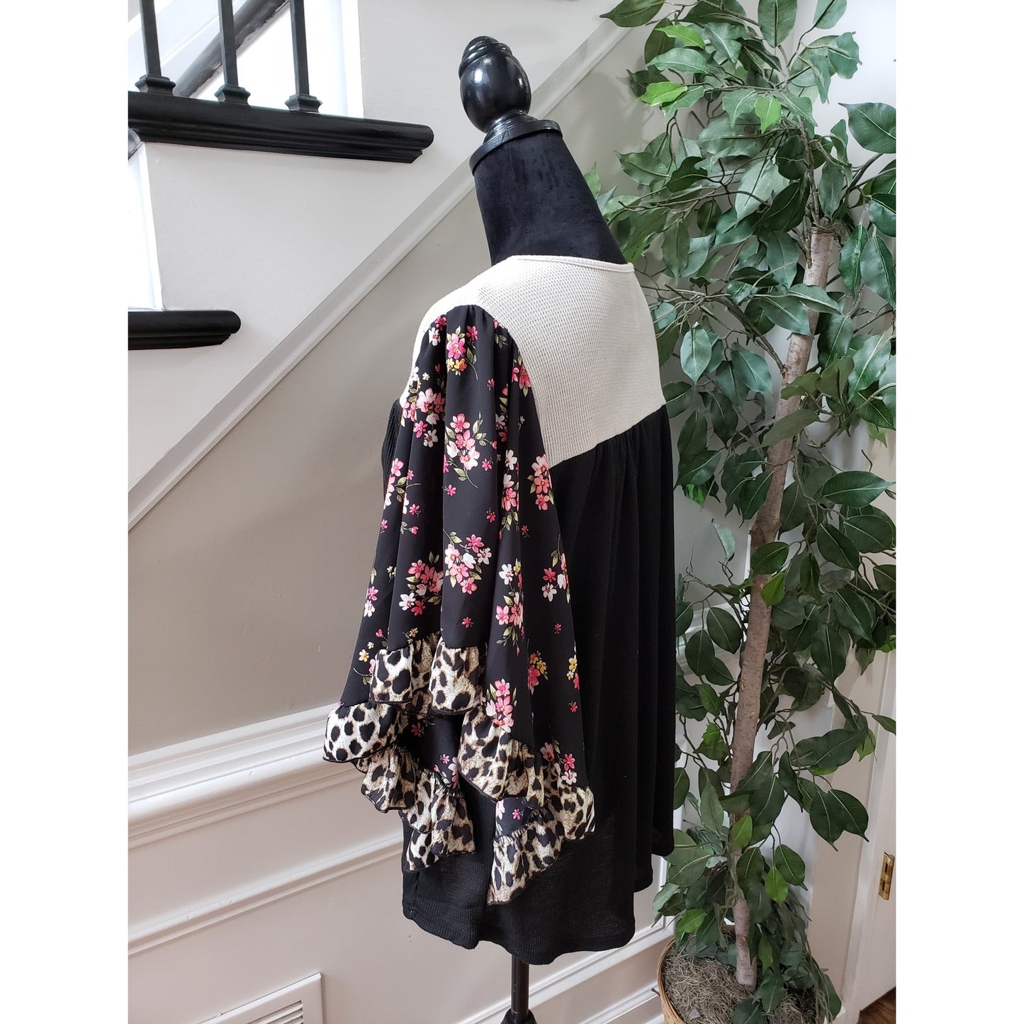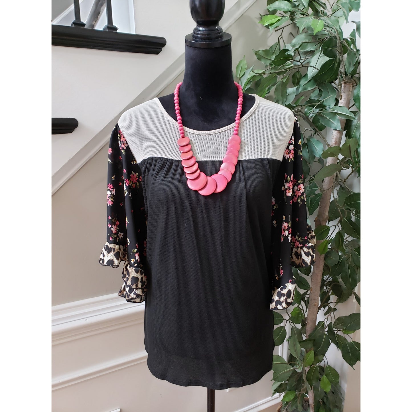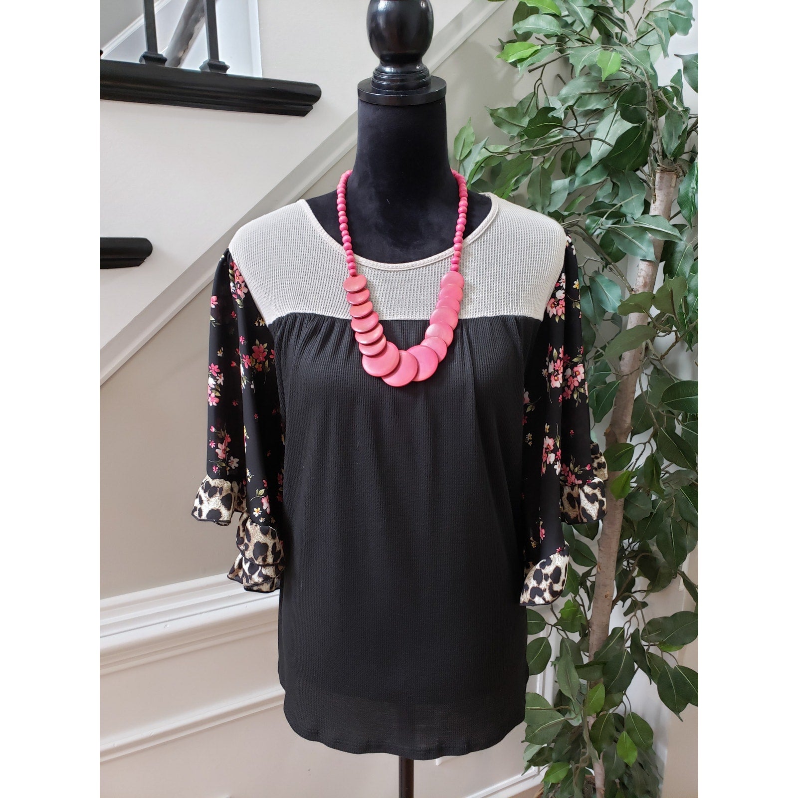 Celeste Top Blouse Women Size Small Black & Beige Floral Short Sleeve Round Neck