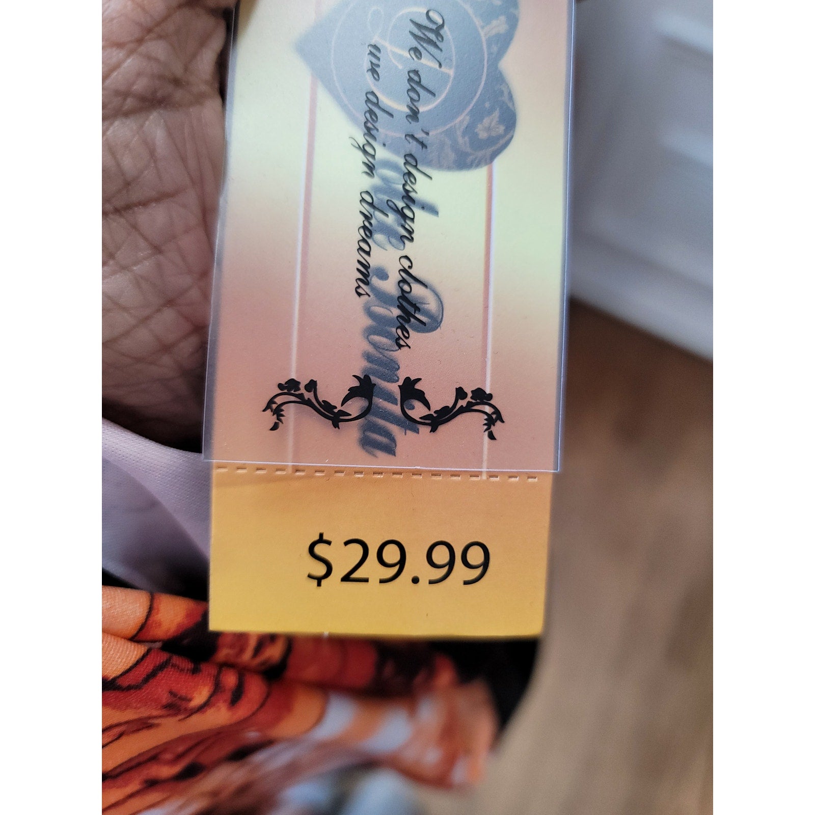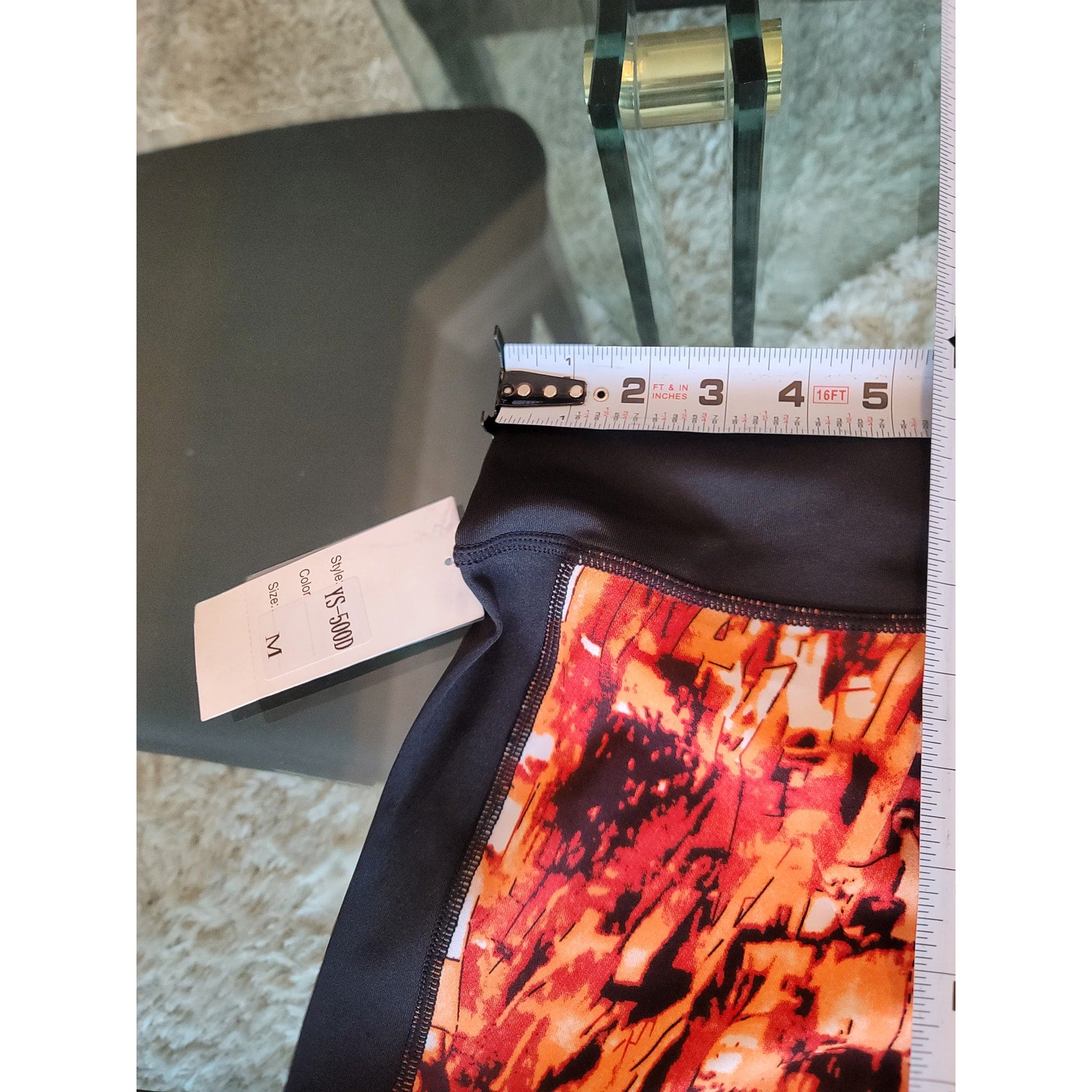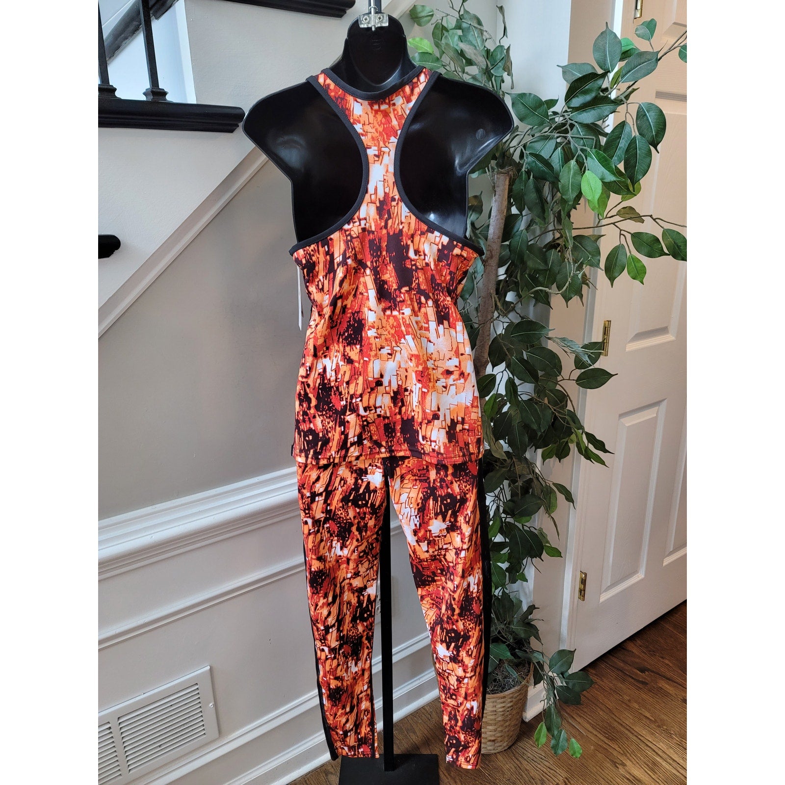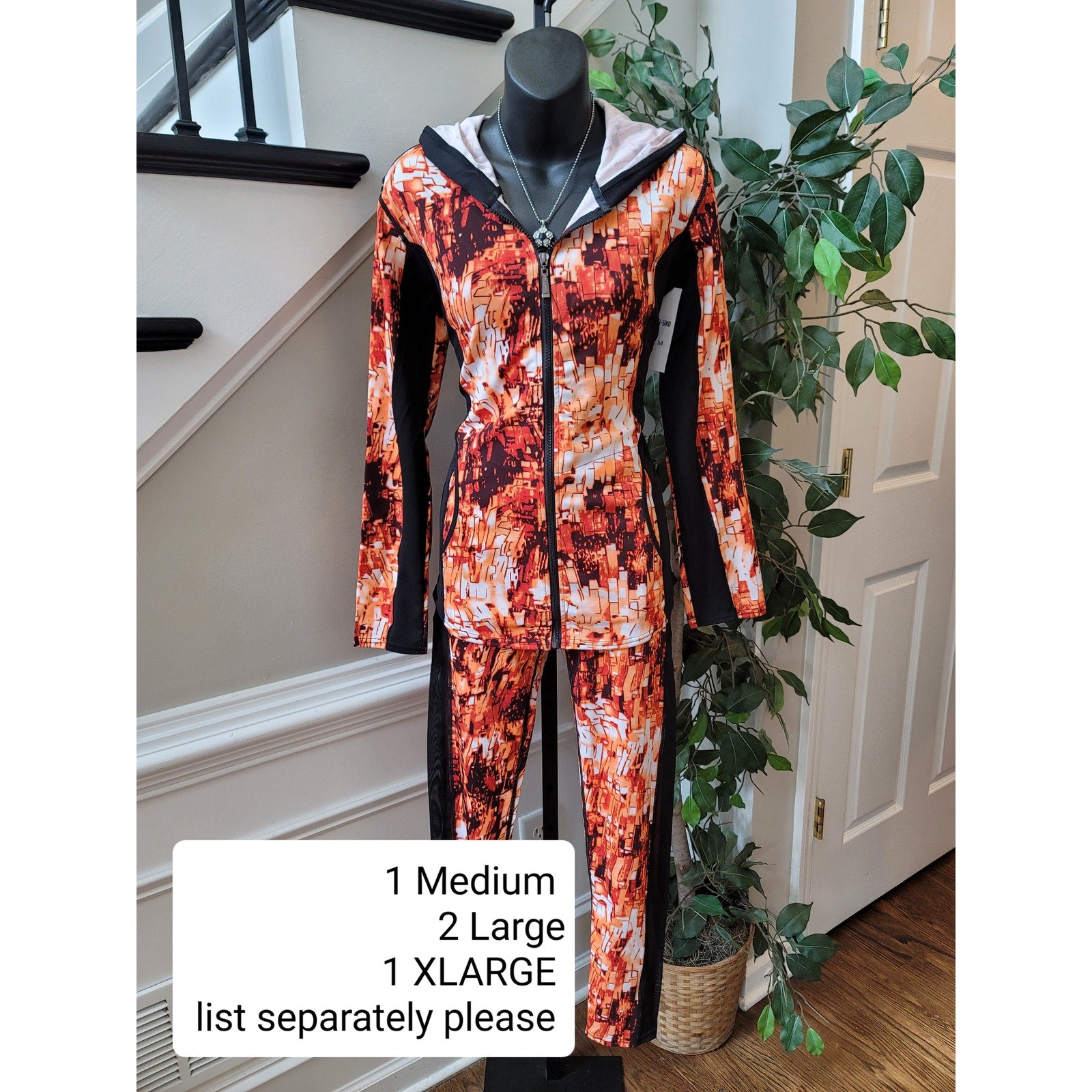 Dolce Bonita three piece women’s activewear set in size Medium. The set includes a matching zip hoodie jacket and leggings in a bold orange and black abstract print. Made from a stretchy polyester spandex blend, this outfit is perfect for workouts, yoga, running, or casual athleisure wear with a flattering fit and modern design.