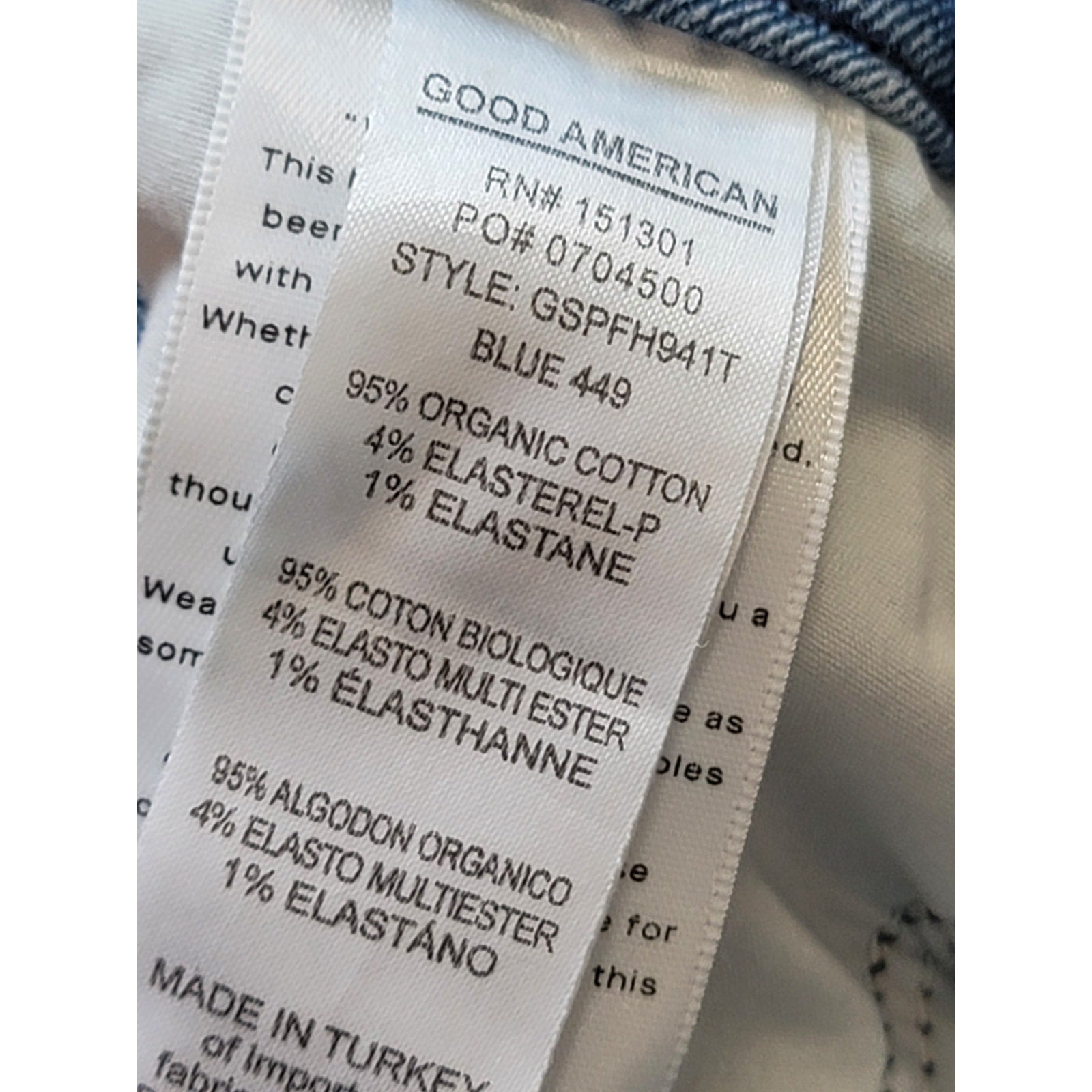 Good American high-rise jeans are the perfect mix of style and comfort. Made with 95% organic cotton, they offer a soft, breathable fit with a touch of stretch from elastane and elastomultiester. The frayed hem adds a trendy, casual touch, making these jeans versatile for both everyday wear and casual outings. Pair them with any top for a chic, effortless look.