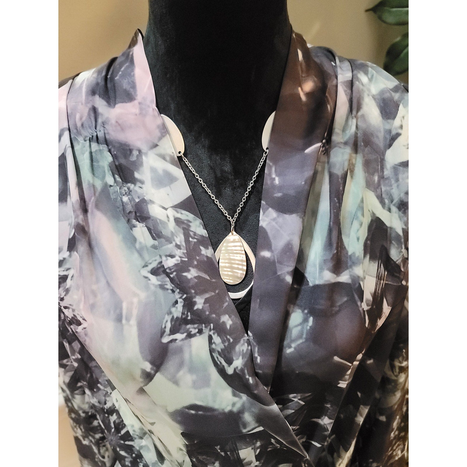 H&M blouse features a draped faux-wrap front with an abstract print in shades of black, gray, and purple. Made with lightweight polyester fabric, it’s perfect for pairing with skirts, trousers, or jeans for both office and evening wear.