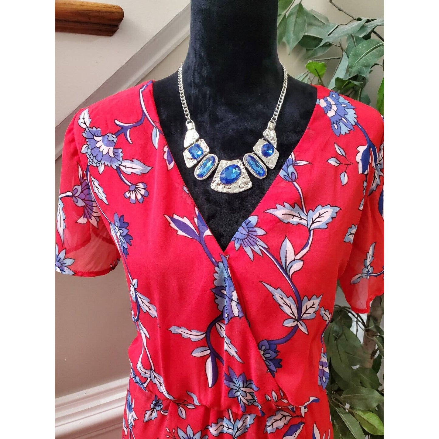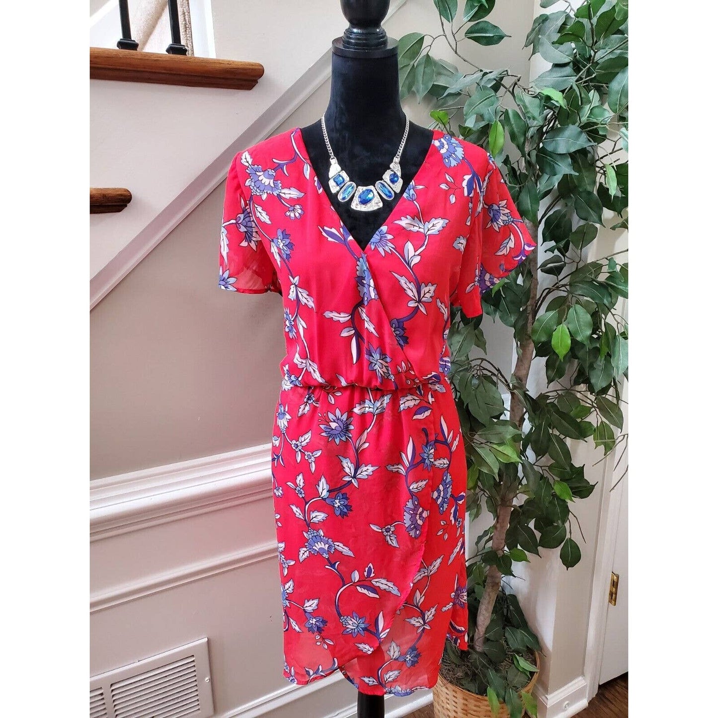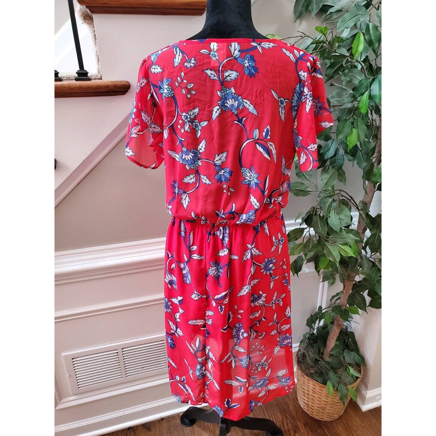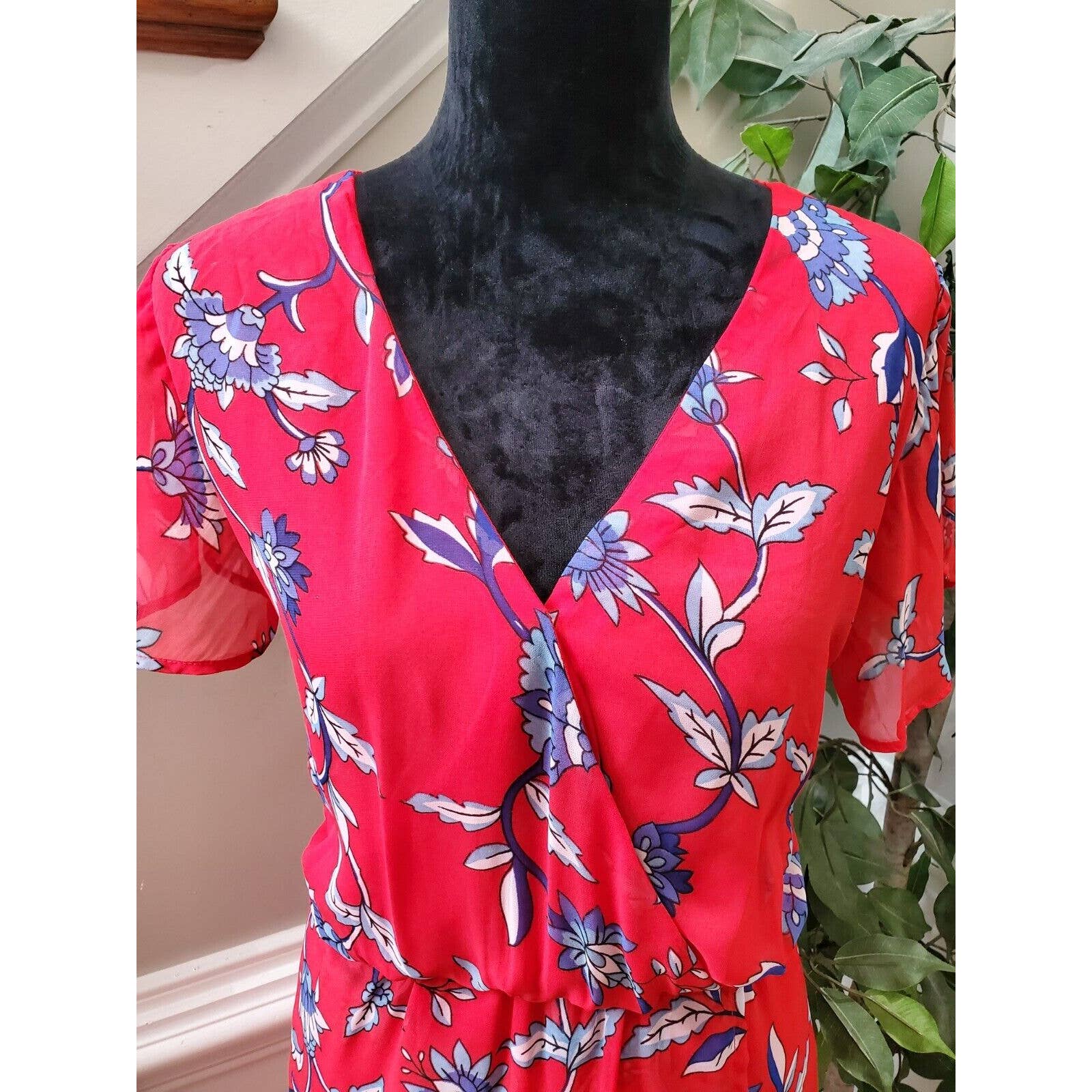Japna Women's Red Floral 100% Polyester V-Neck Short Sleeves Knee Length Dress L.