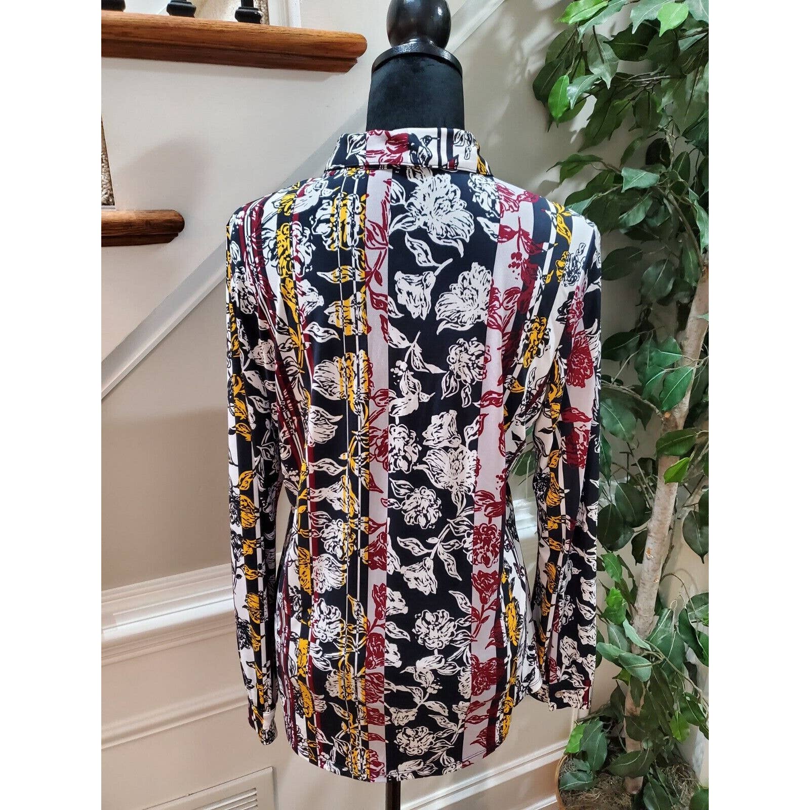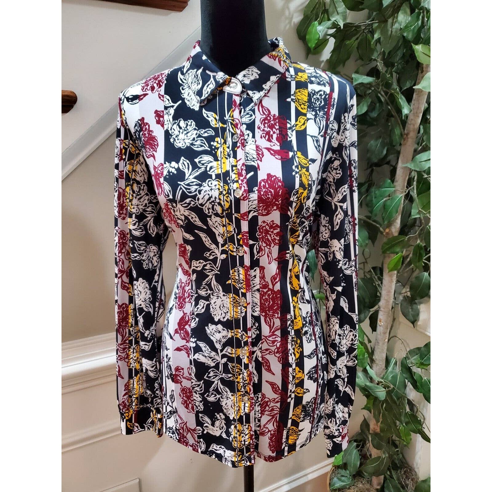 Jones New York Women Floral Polyester Collared Long Sleeve Button Down Shirt L
