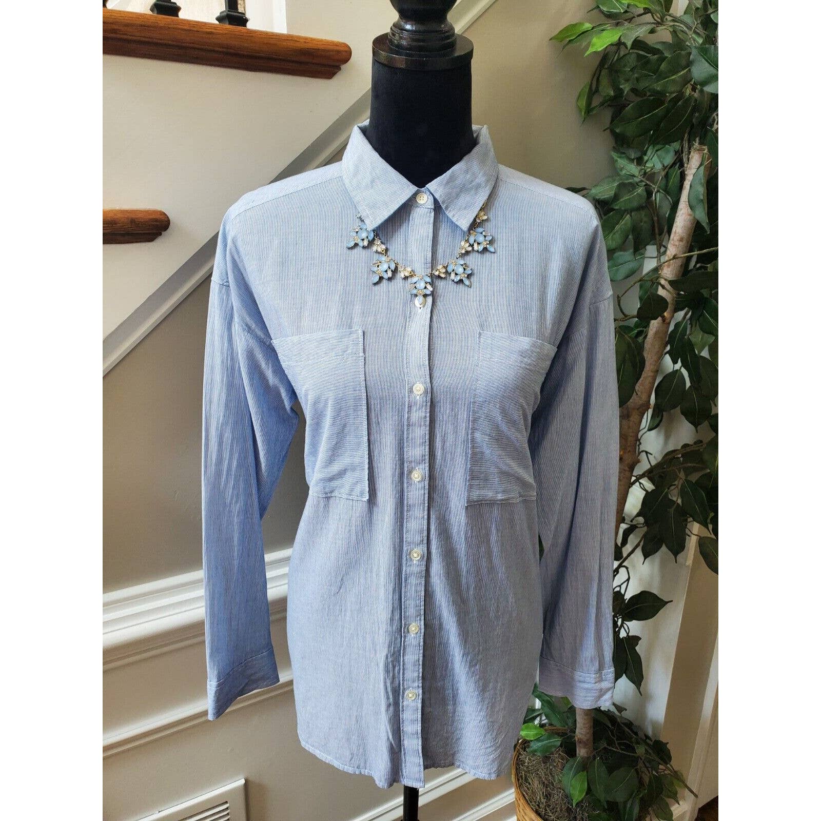 Loft Women's Blue 100% Cotton Collared Long Sleeve Button Down Casual Shirt L