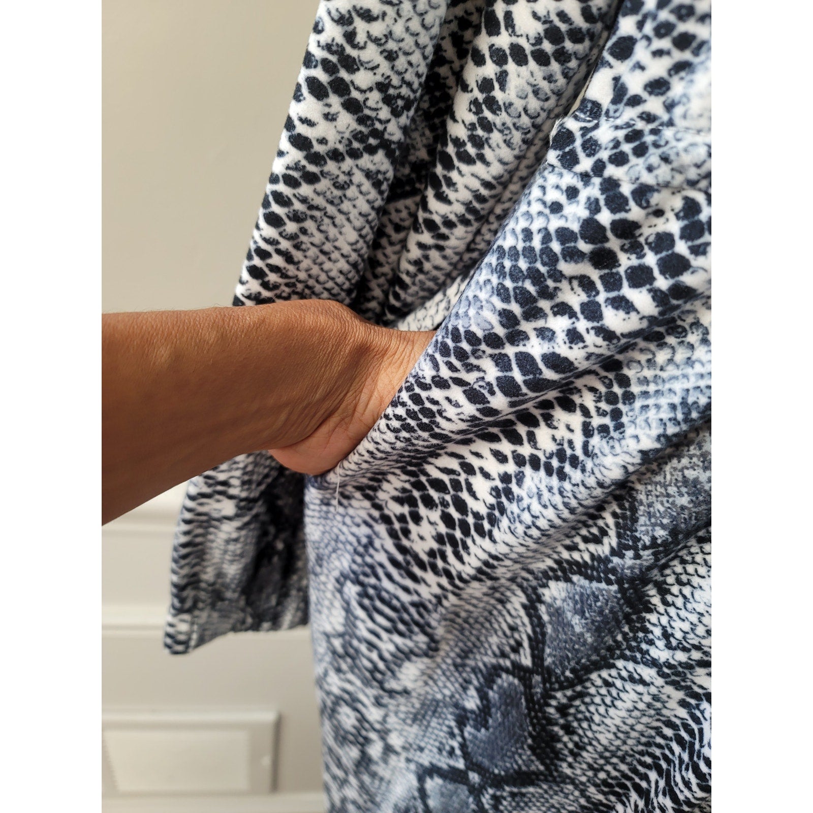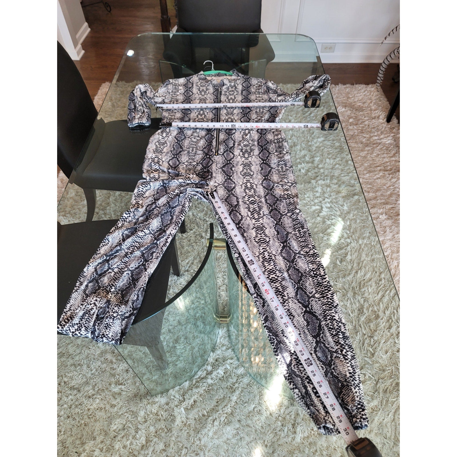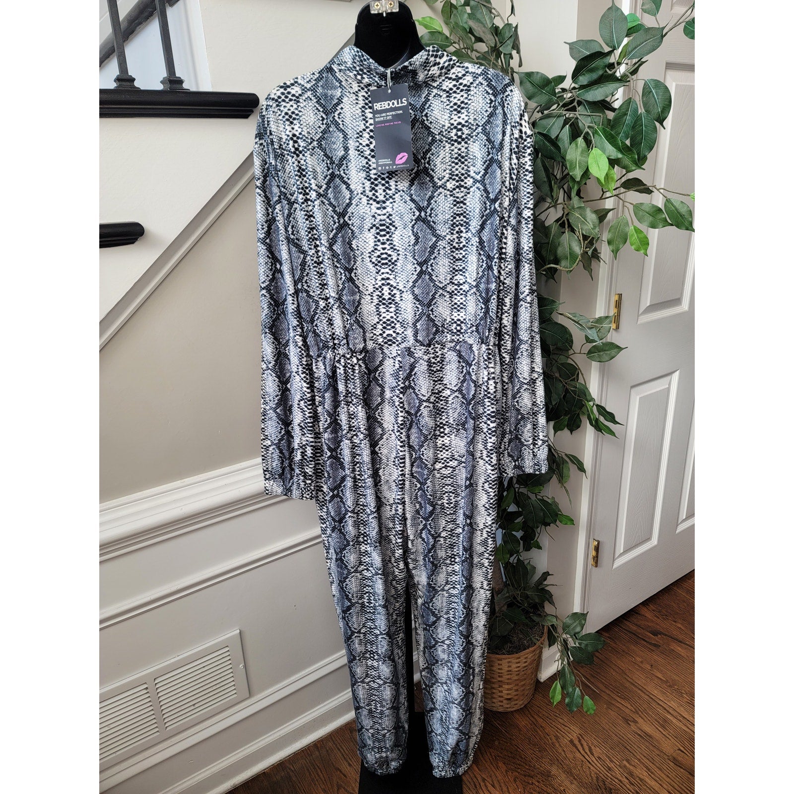 Rebdolls women’s jumpsuit in size XL. Designed in NYC, it features a striking gray and black snake print, full zip front, and drawstring waist for a flattering fit. The long sleeve design with tapered legs creates a sleek silhouette, while the soft stretch polyester spandex blend ensures comfort for lounging or casual outings.