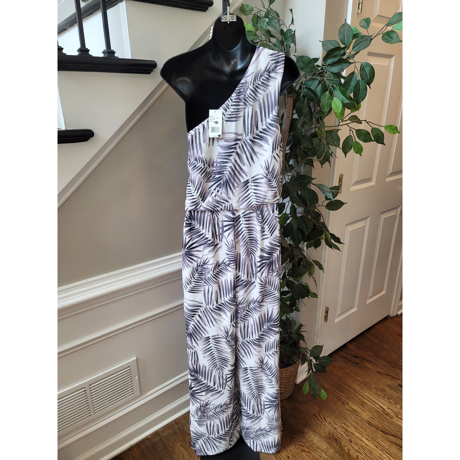 Sam Edelman one shoulder romper in size 4. Featuring a chic white base with bold black tropical leaf print, this sleeveless design exudes elegance and modern style. Crafted from a comfortable polyester spandex blend with a soft lining, it’s perfect for summer parties, vacations, or evening events. A timeless statement piece for any occasion.