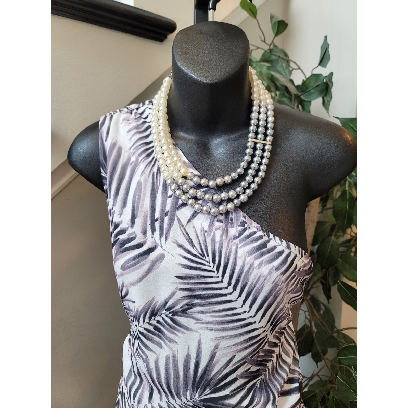 Color: White with black leaf print