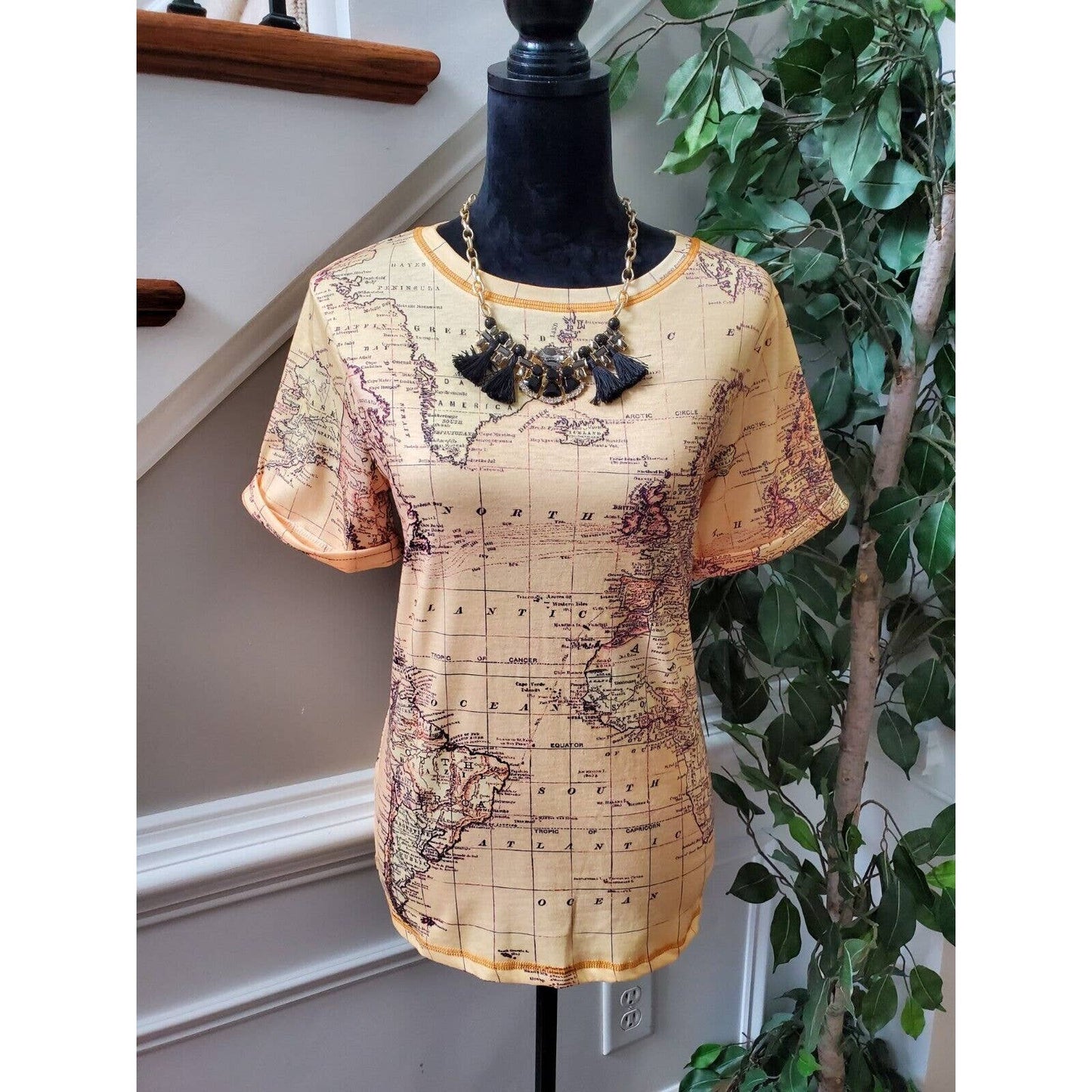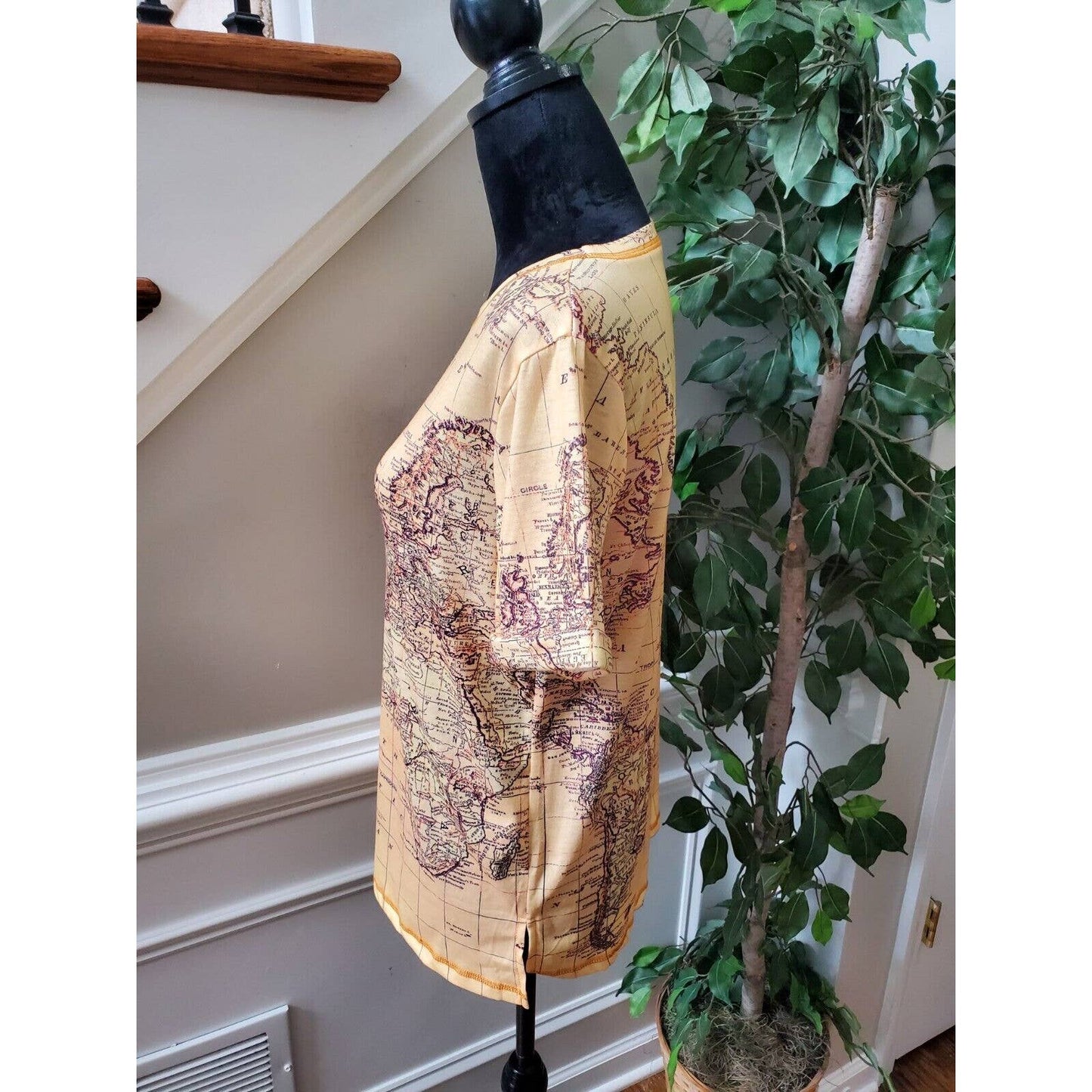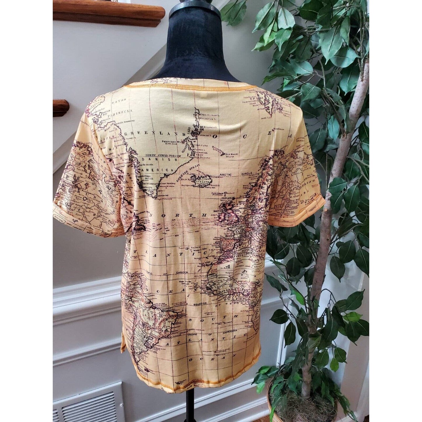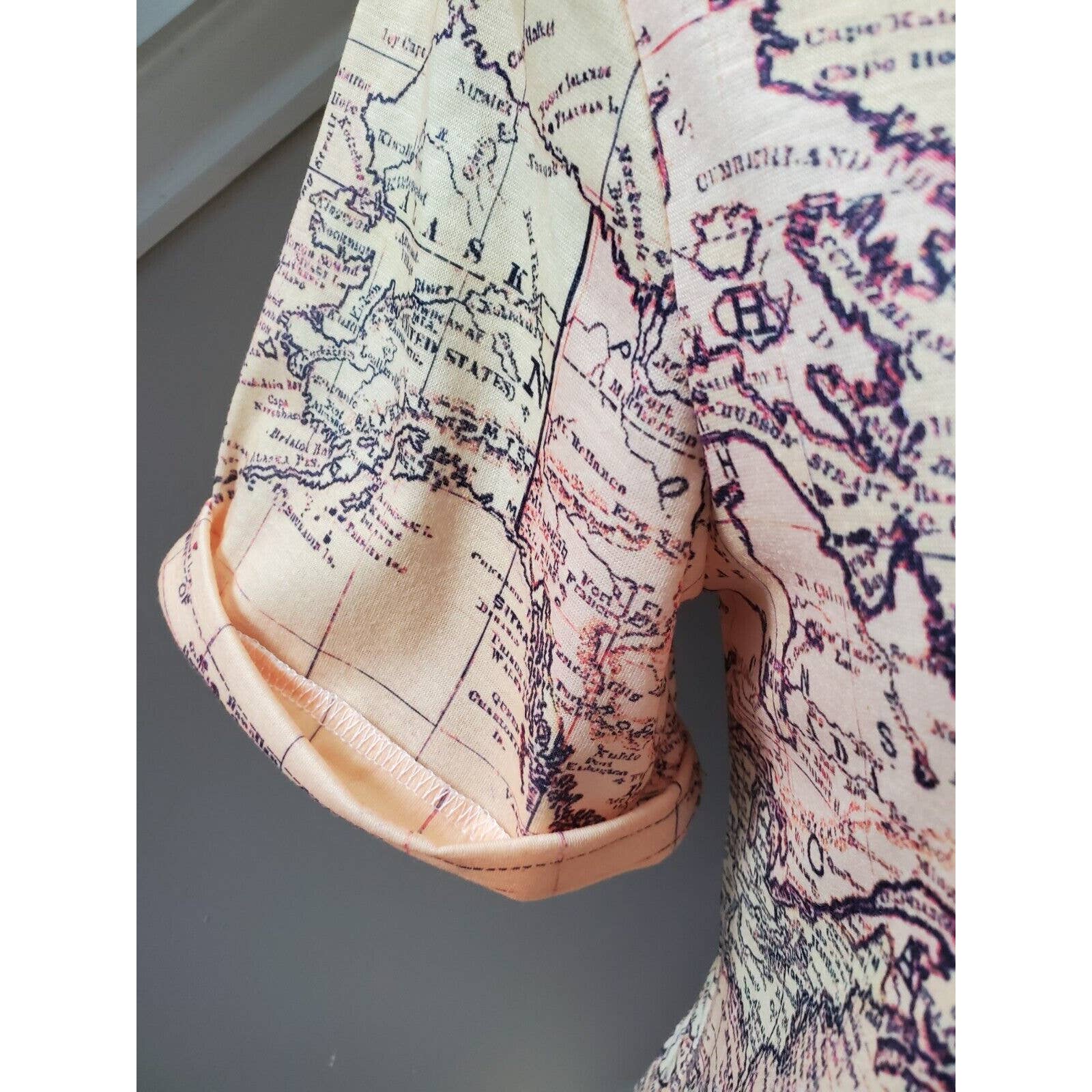 SHEIN Women Beige Map Polyester Crew Neck Short Sleeve Casual Top Shirt Small