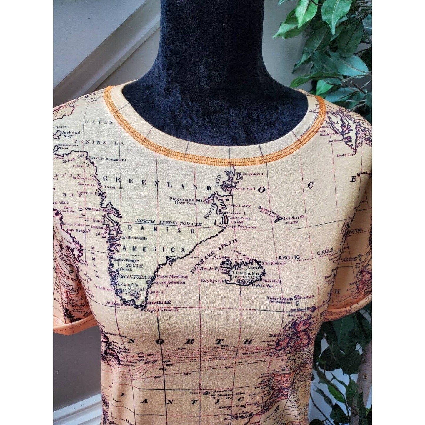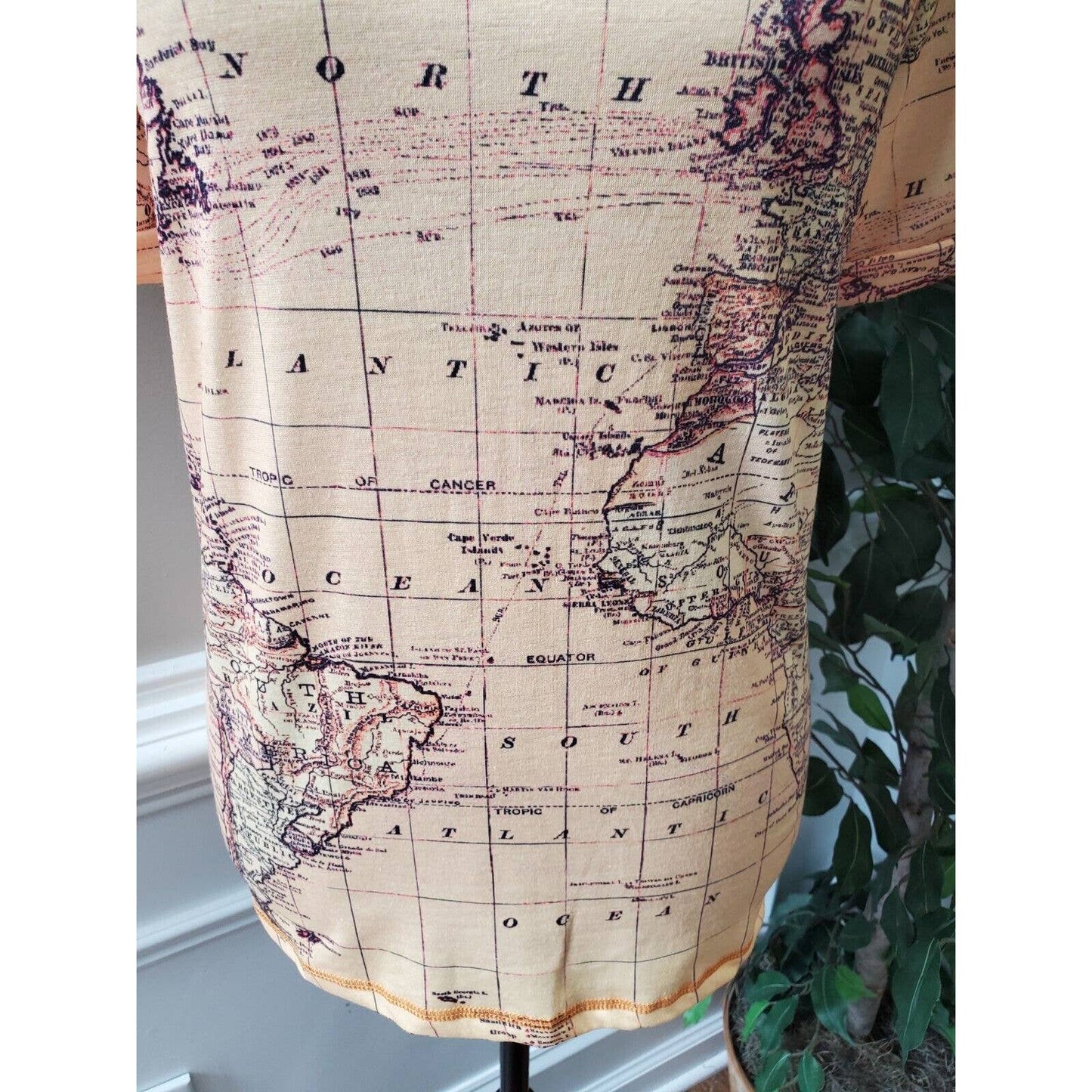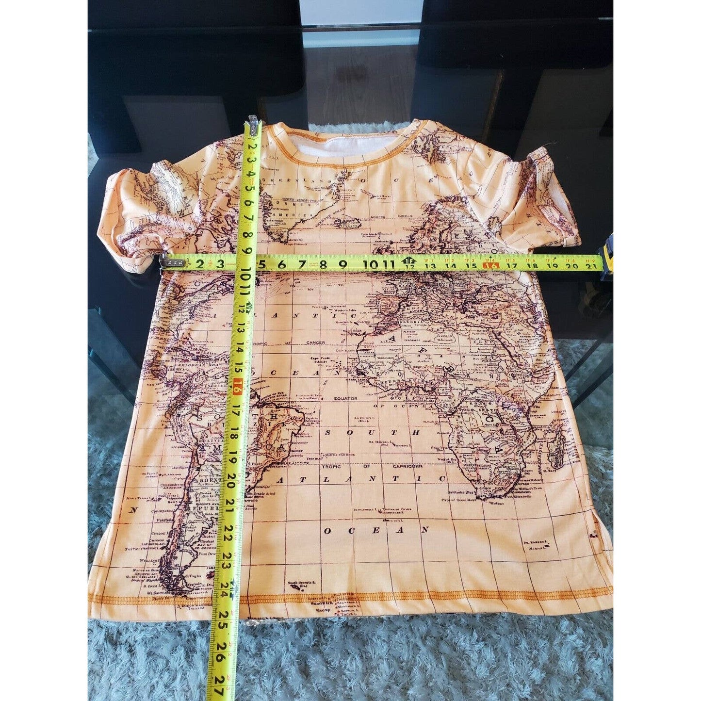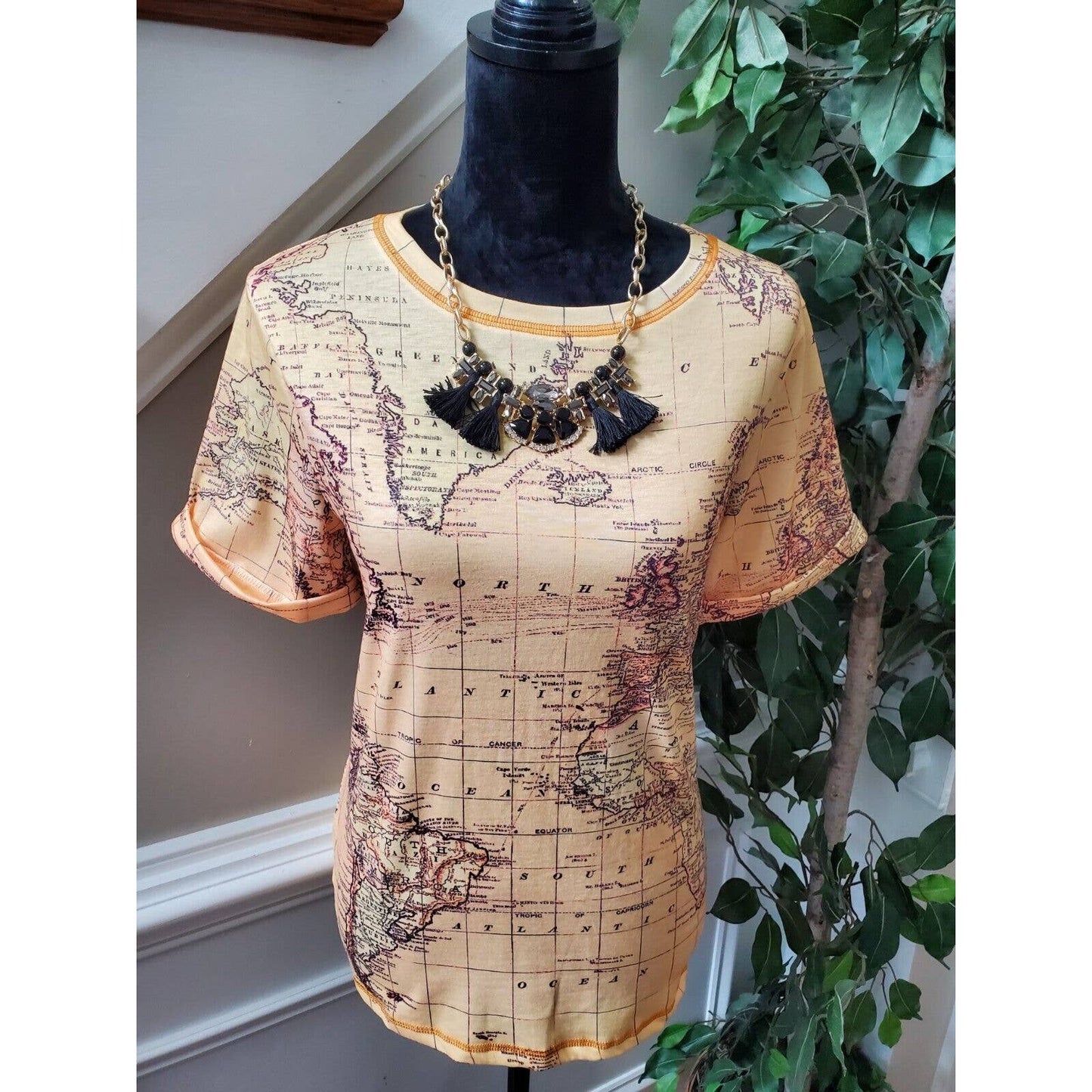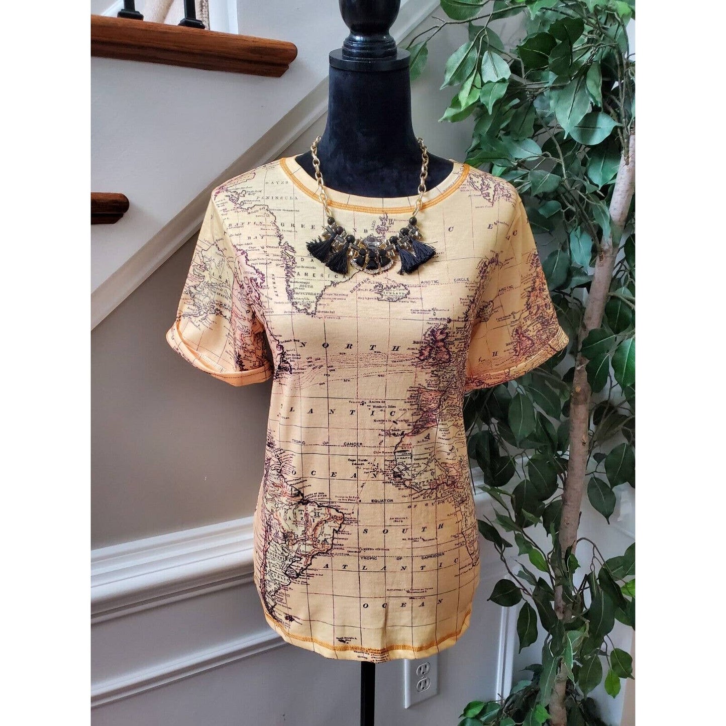 SHEIN Women Beige Map Polyester Crew Neck Short Sleeve Casual Top Shirt Small