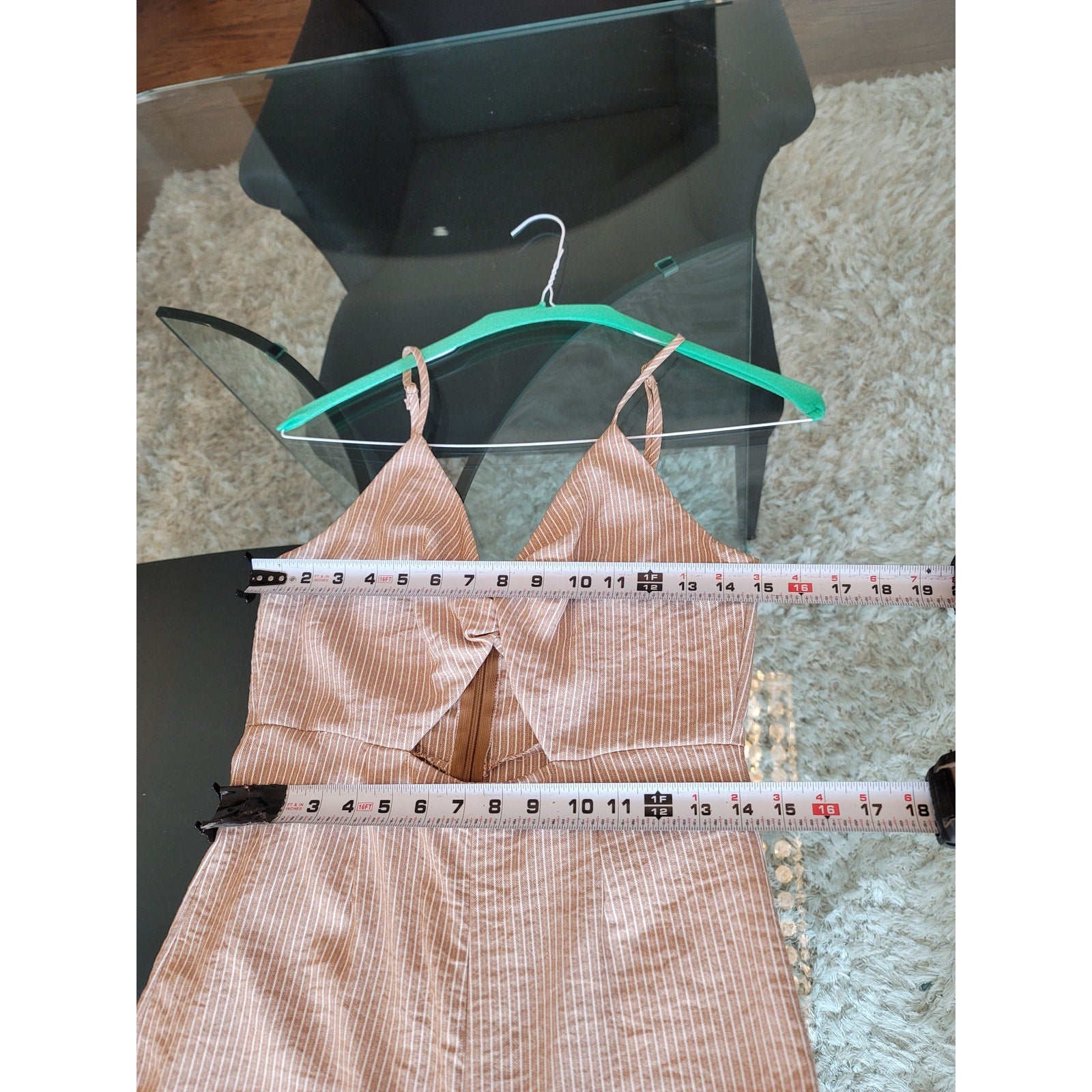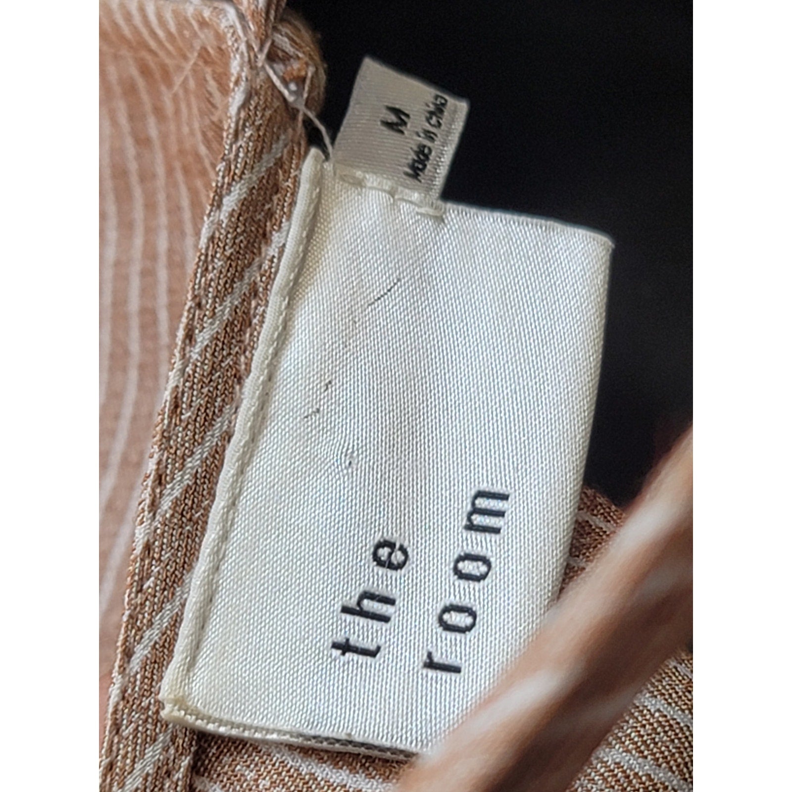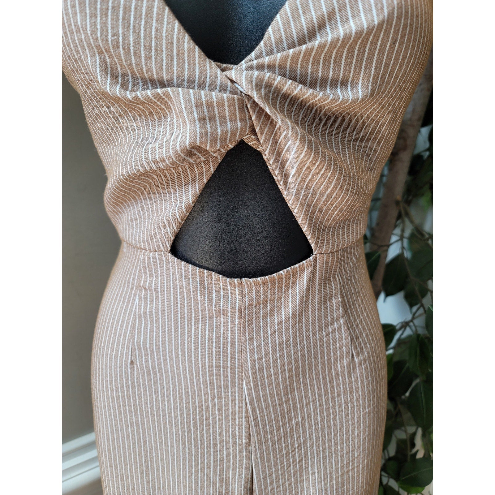The Room women’s jumpsuit in size medium. Designed in a beige and white pinstripe pattern, it features adjustable spaghetti straps, a front twist cutout detail, and wide-leg pants for a flattering fit. Perfect for summer parties, vacations, or casual outings, this sleeveless jumpsuit blends comfort with modern sophistication.