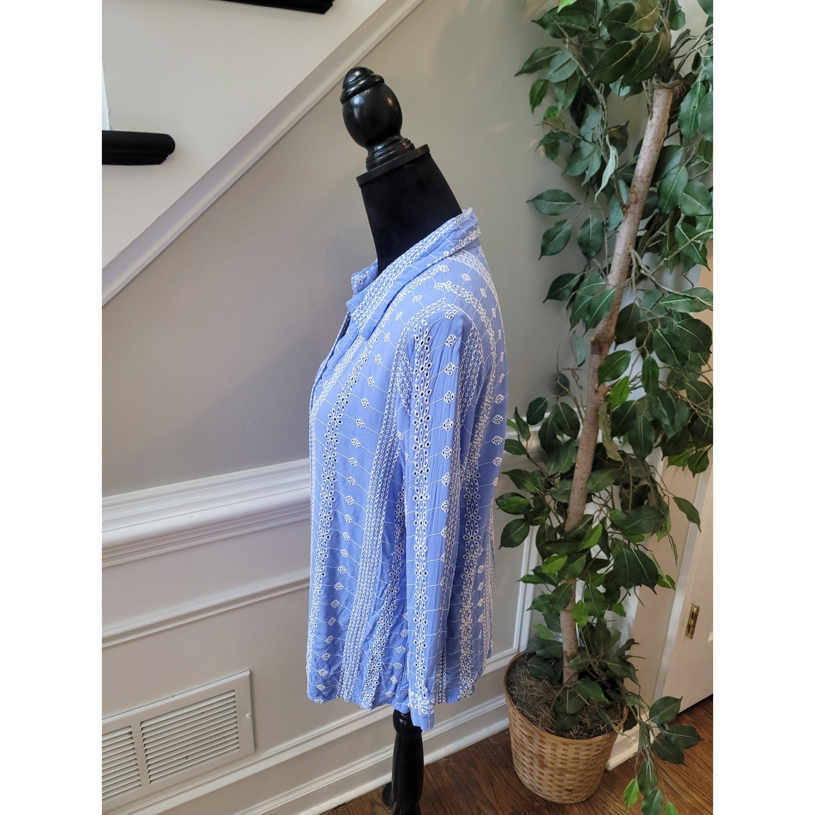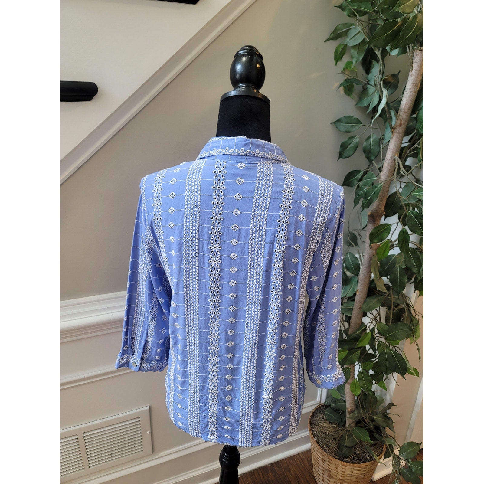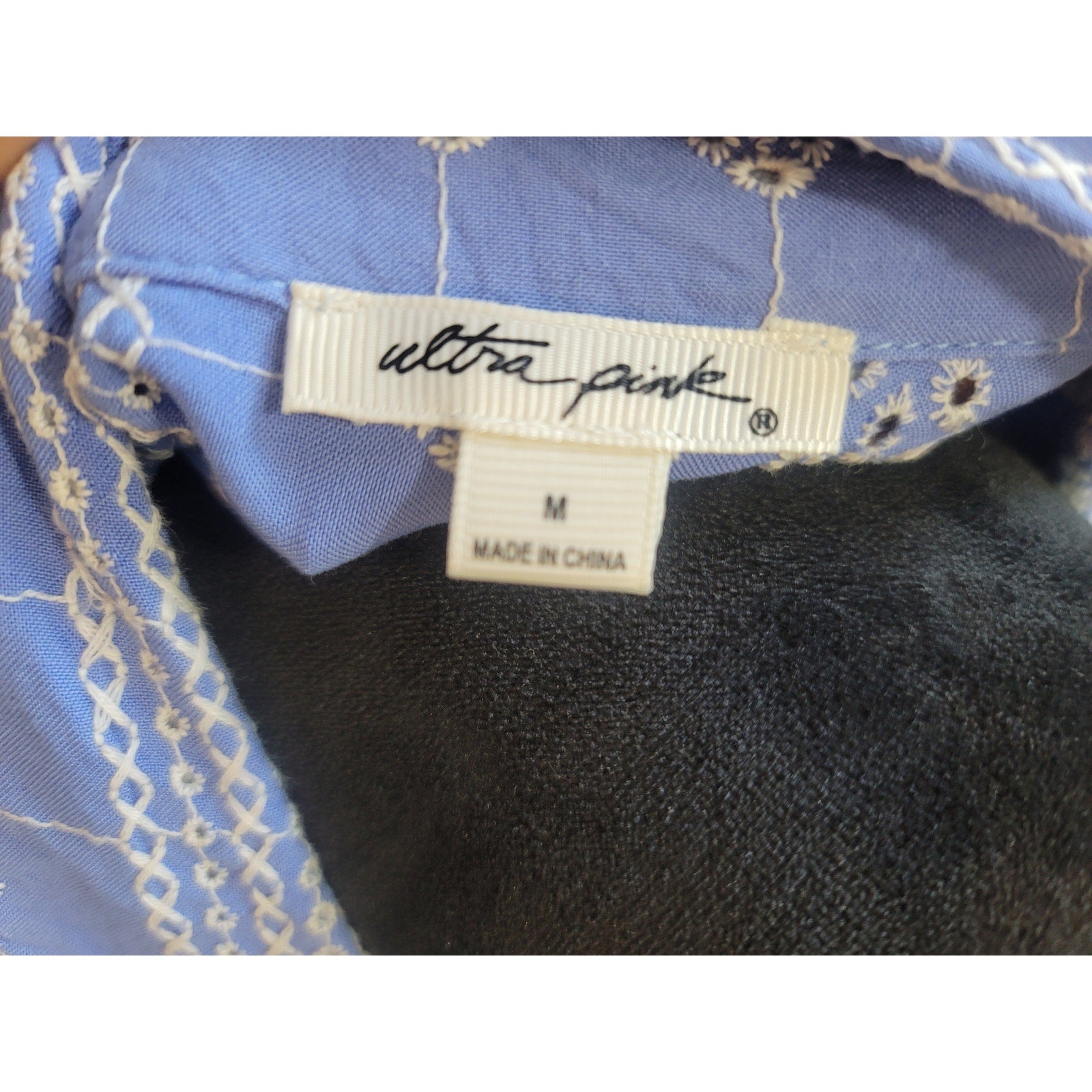 Ultra Pink women’s button-front blouse in size Medium offers a stylish and feminine look with its light blue base and delicate white floral embroidered pattern. Made of 100% rayon, it provides a soft, breathable feel that’s perfect for everyday wear or casual outings. Featuring 3/4 sleeves, a collared neckline, and lightweight fabric, this blouse combines comfort with effortless style.