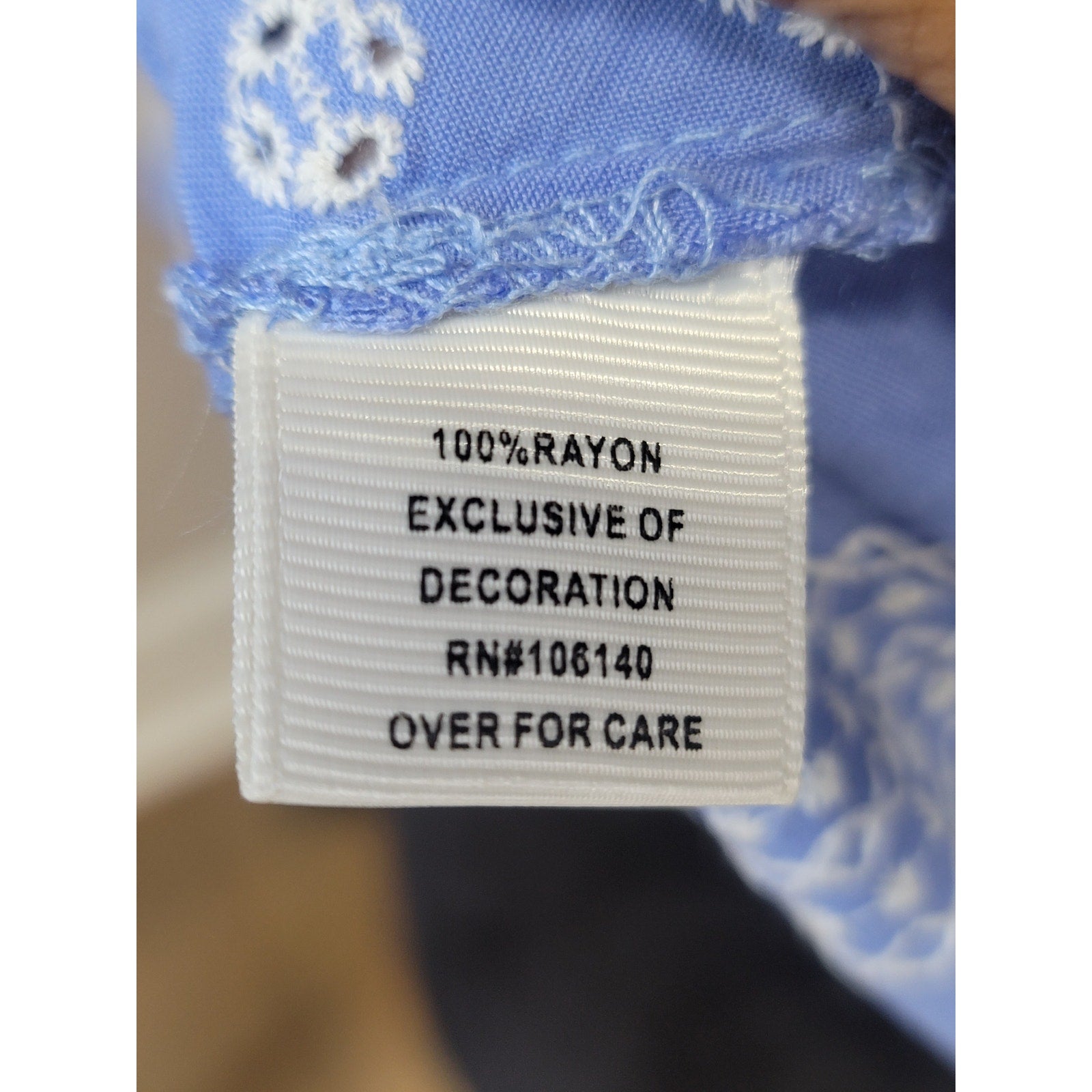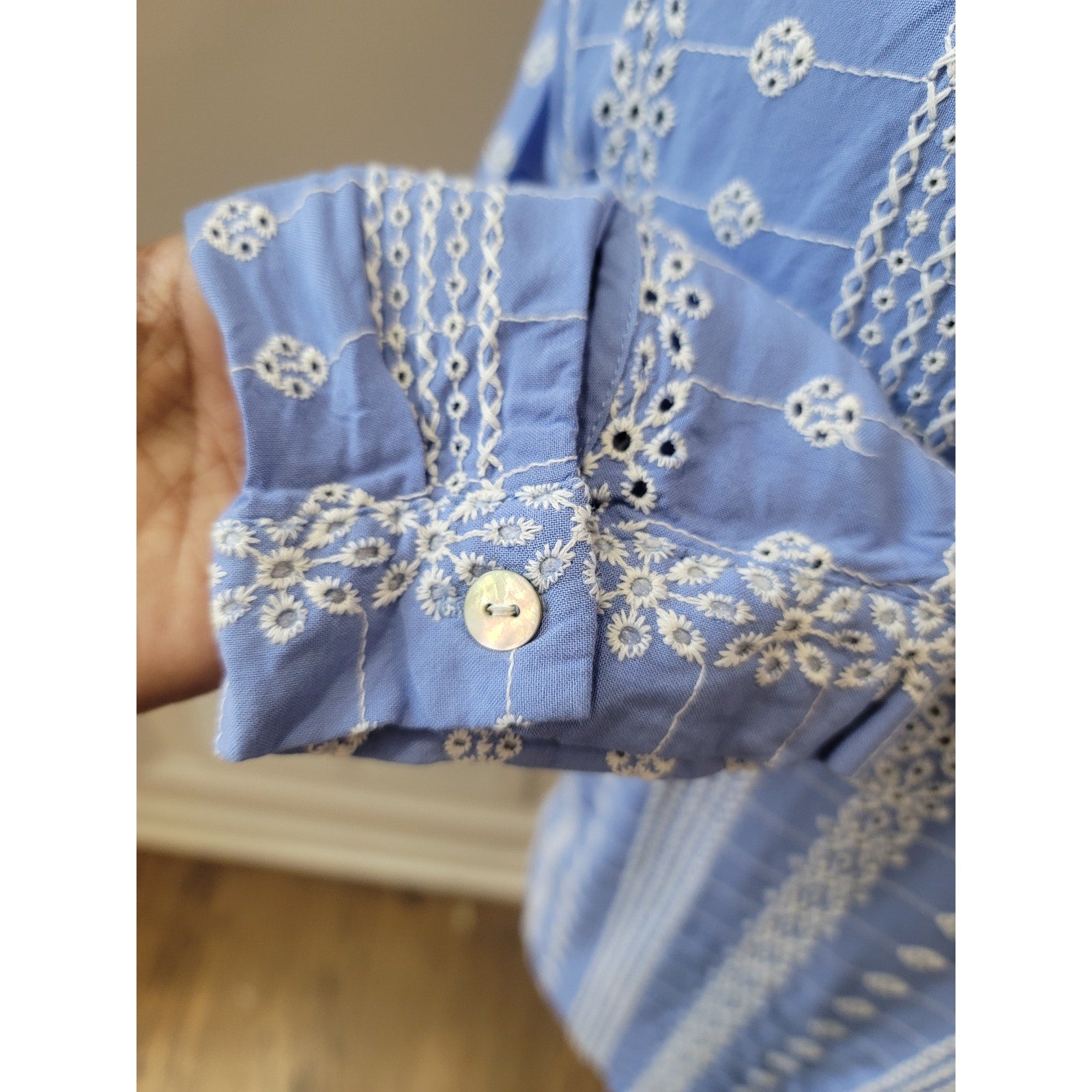 Color: Blue with white embroidered floral design