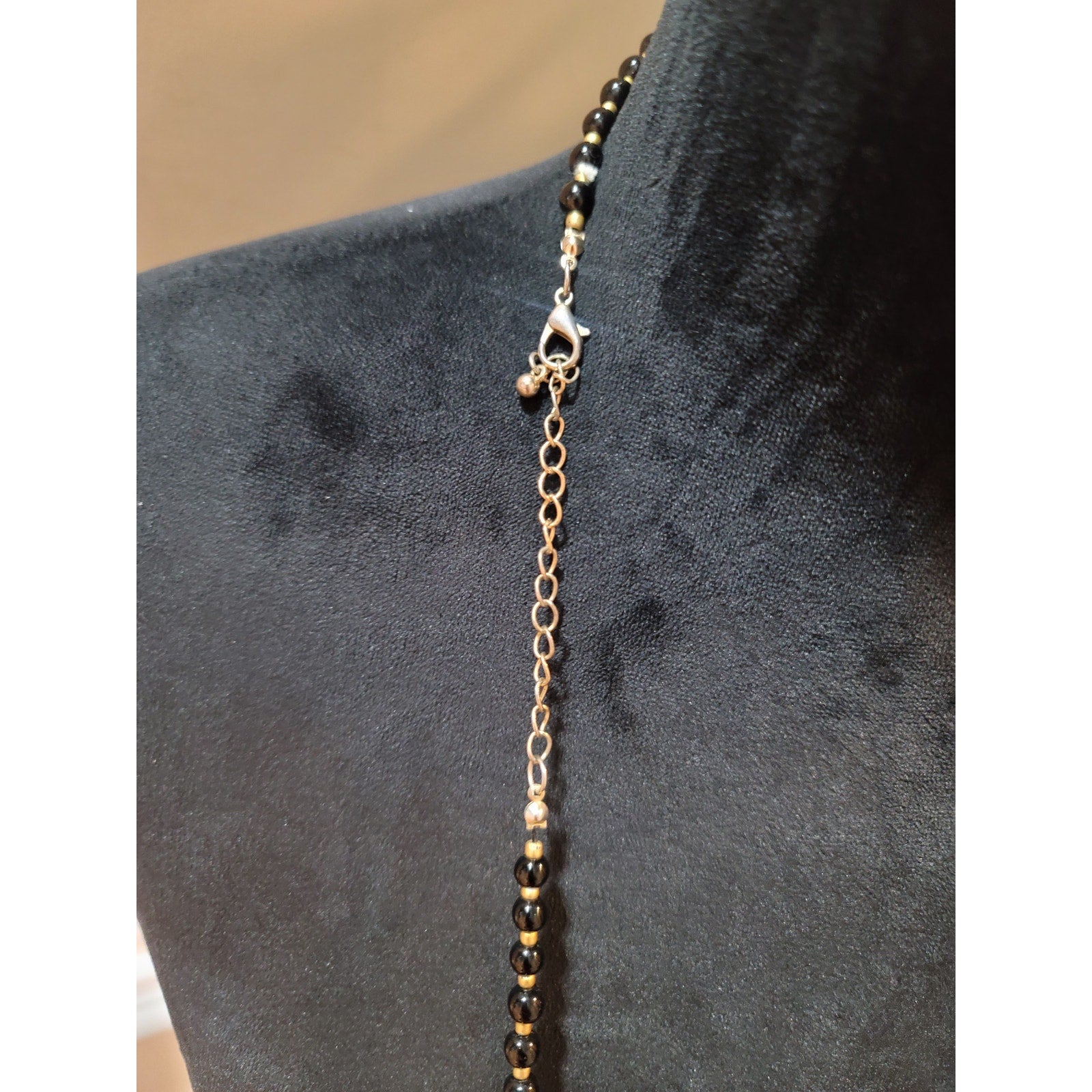 Women's Black Beaded Necklace With Gold Accents Tassel Pendant Lobster Clasp