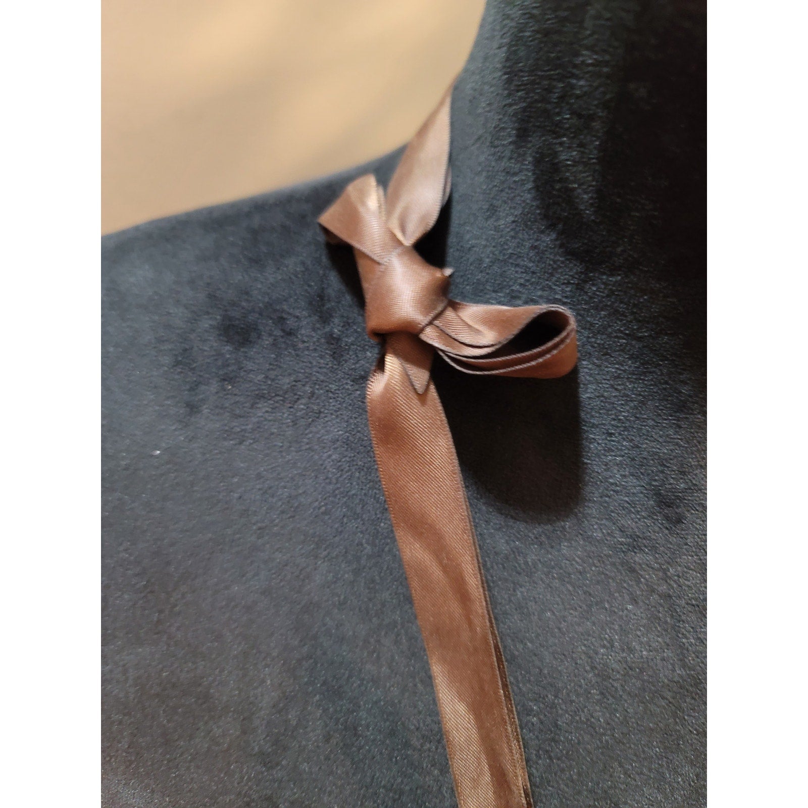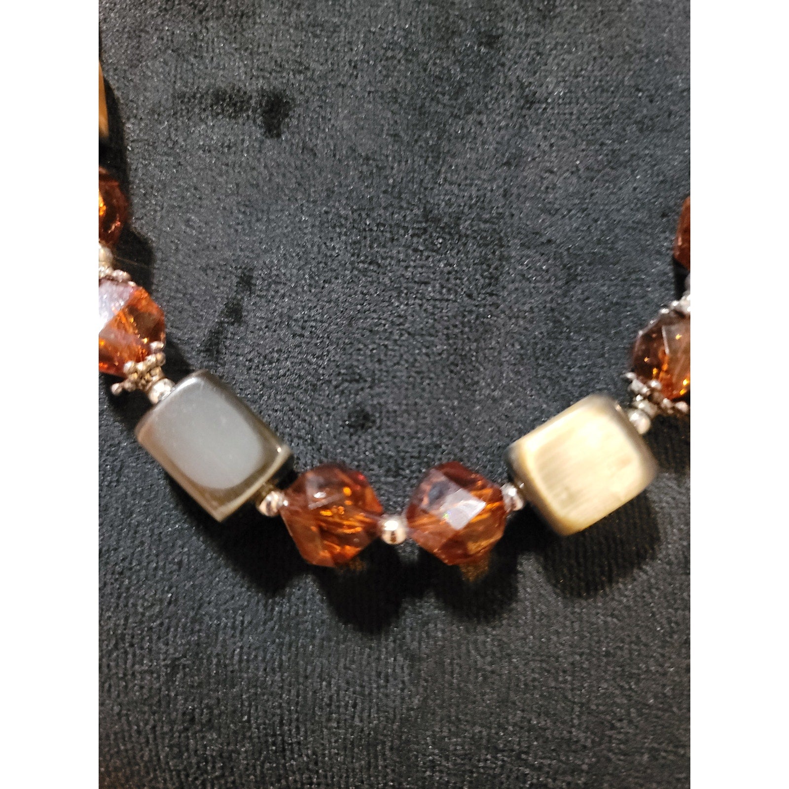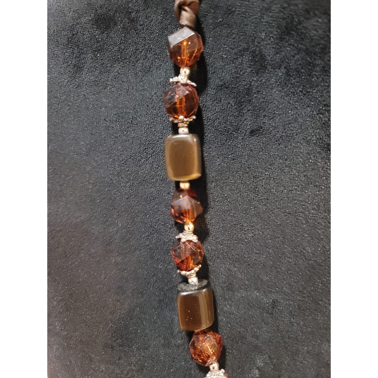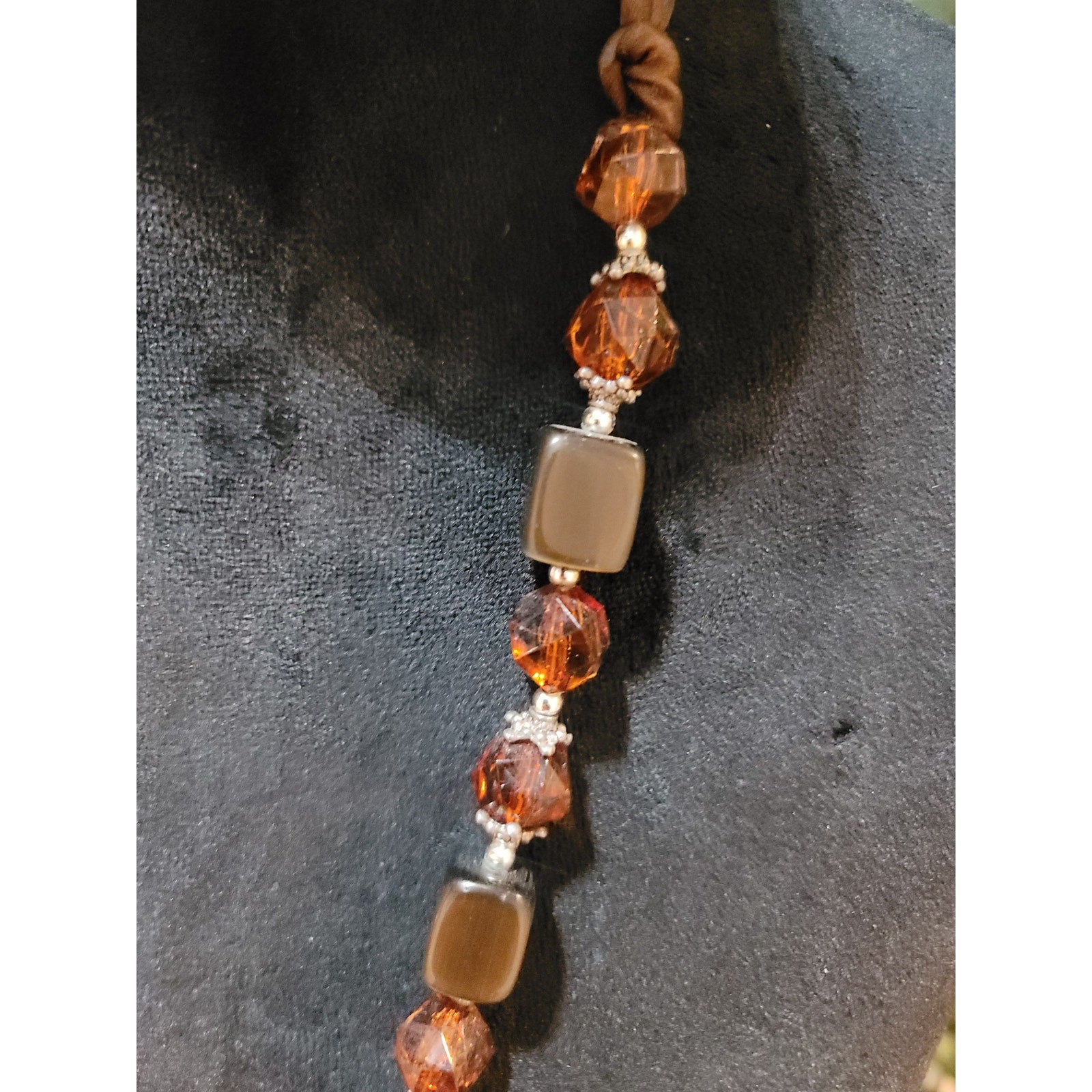 Women's Brown Ribbon Tie Beaded Necklace With Amber Crystal And Square Beads