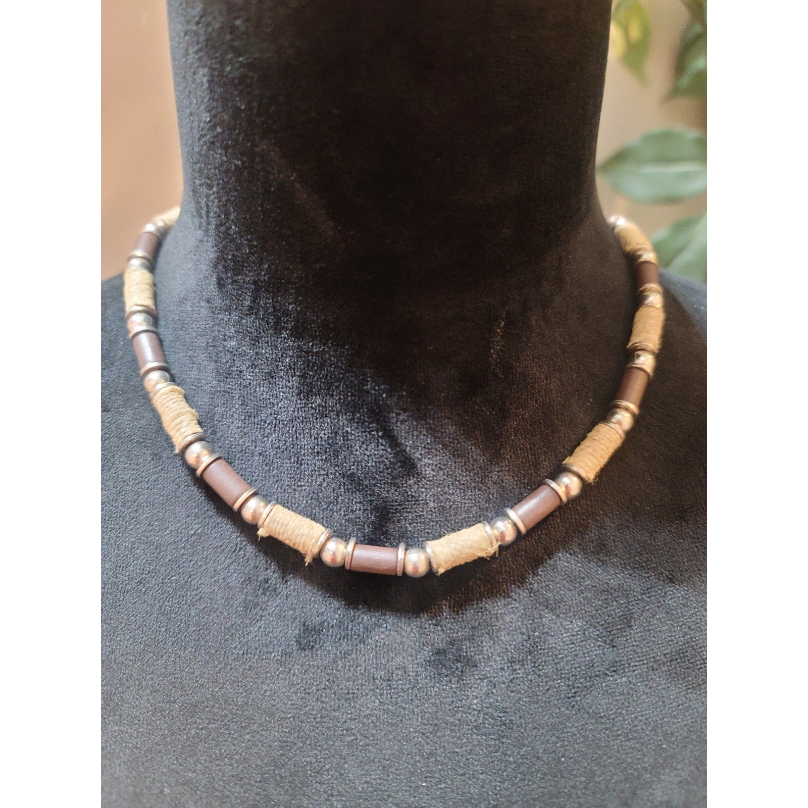 Women's Handmade Beaded Necklace With Wooden Tubes Rope Accents And Lobster Lock