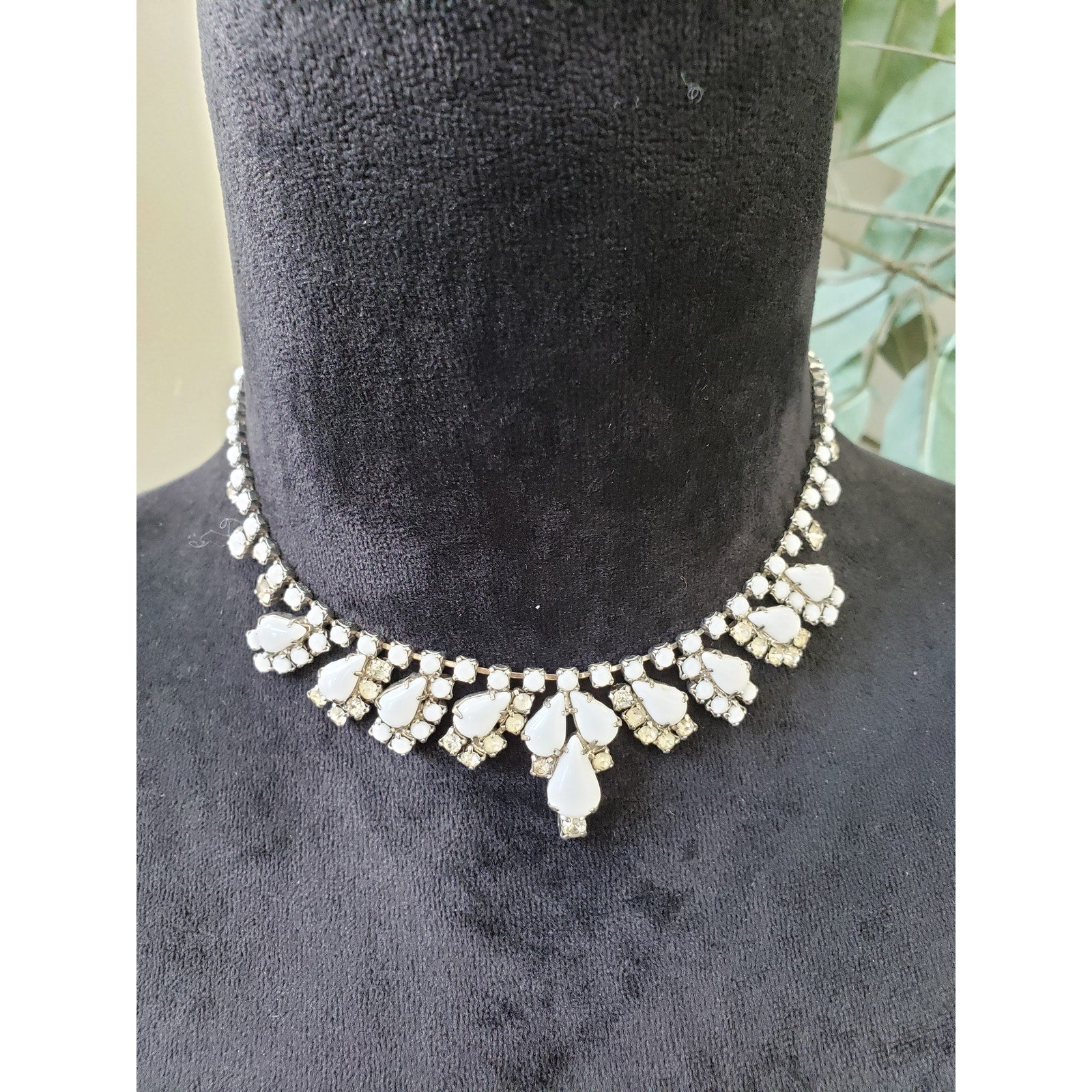 Womens Silver Tone Milk Glass Rhinestone Choker Necklace Jewelry with Hook & Eye.